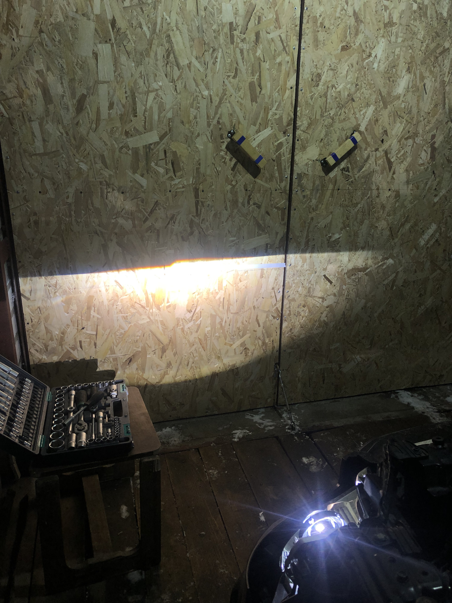 Перед началом работ загнал авто в гараж на ровную поверхность, чтобы облегчить регулировку света новых линз я начертил границы световой границы на воротах, после этого соответственно авто никуда не двигалось.