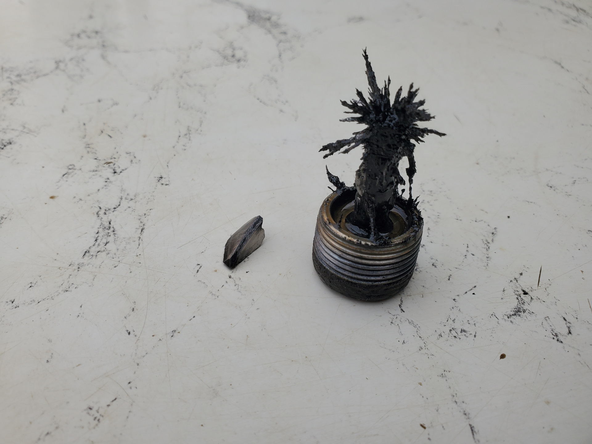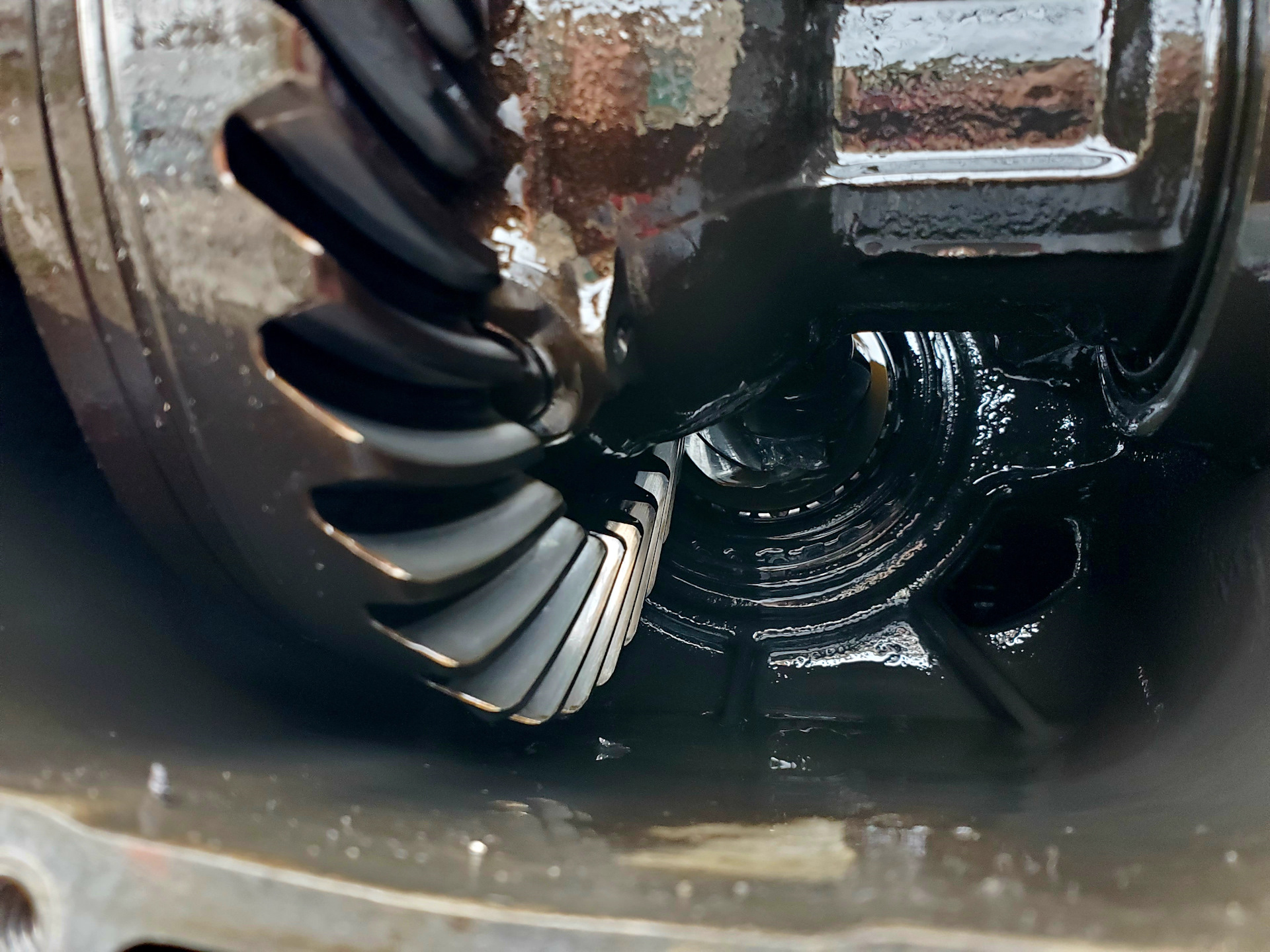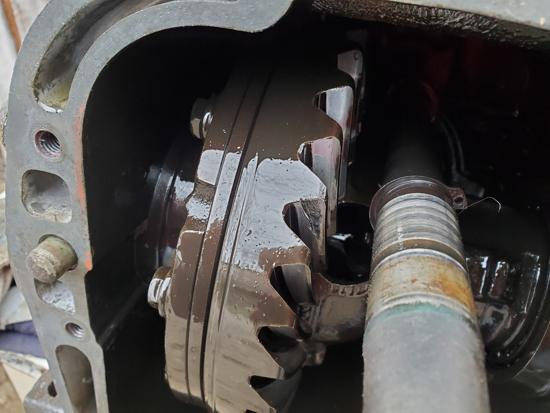 С кумом в четыре руки быстро скинули, слили на удивление чистое масло, но на магните пробки обнаружился ёжик. А сняв колокол, обнаружил и зуб от хвостовика 😖