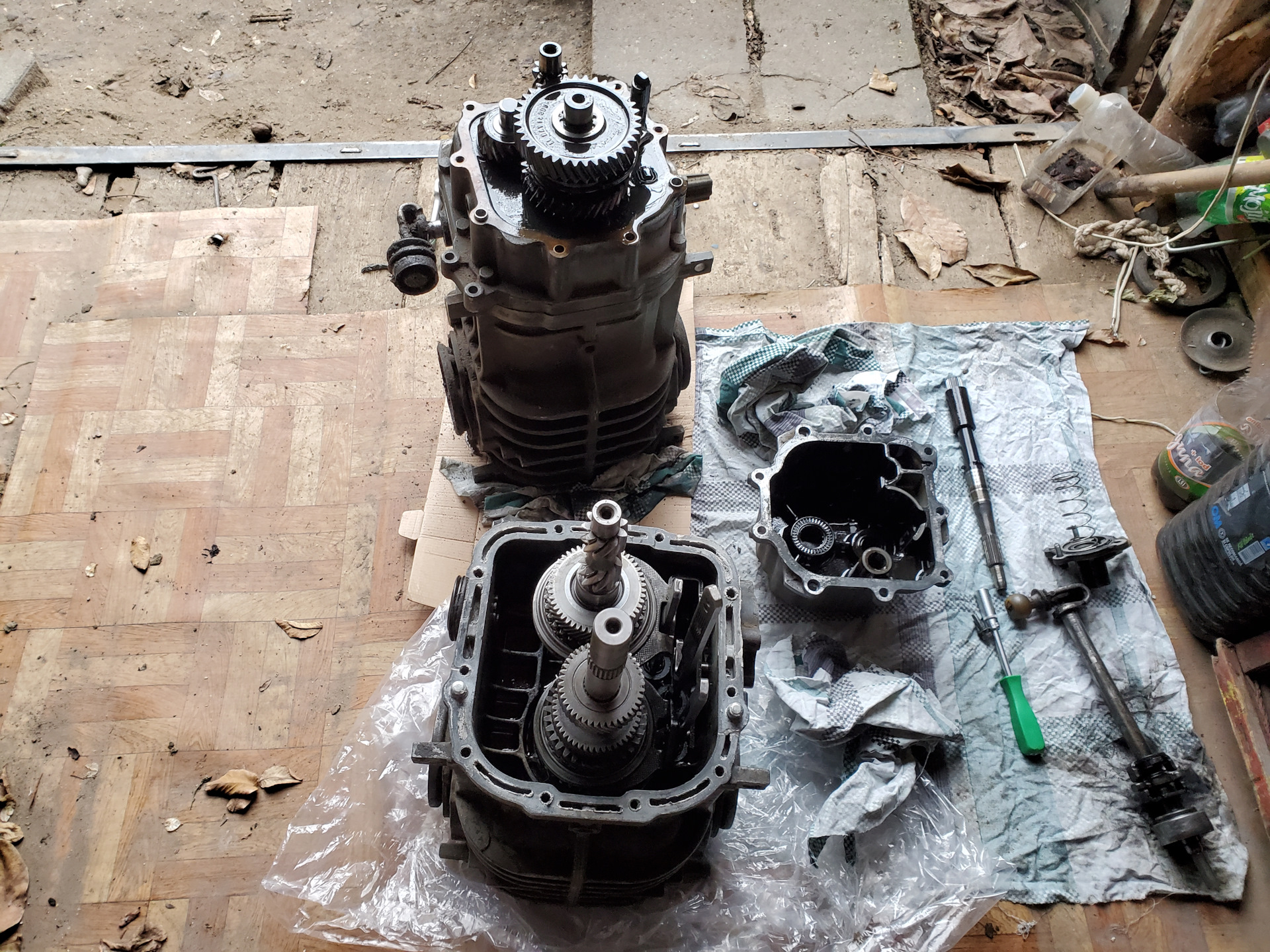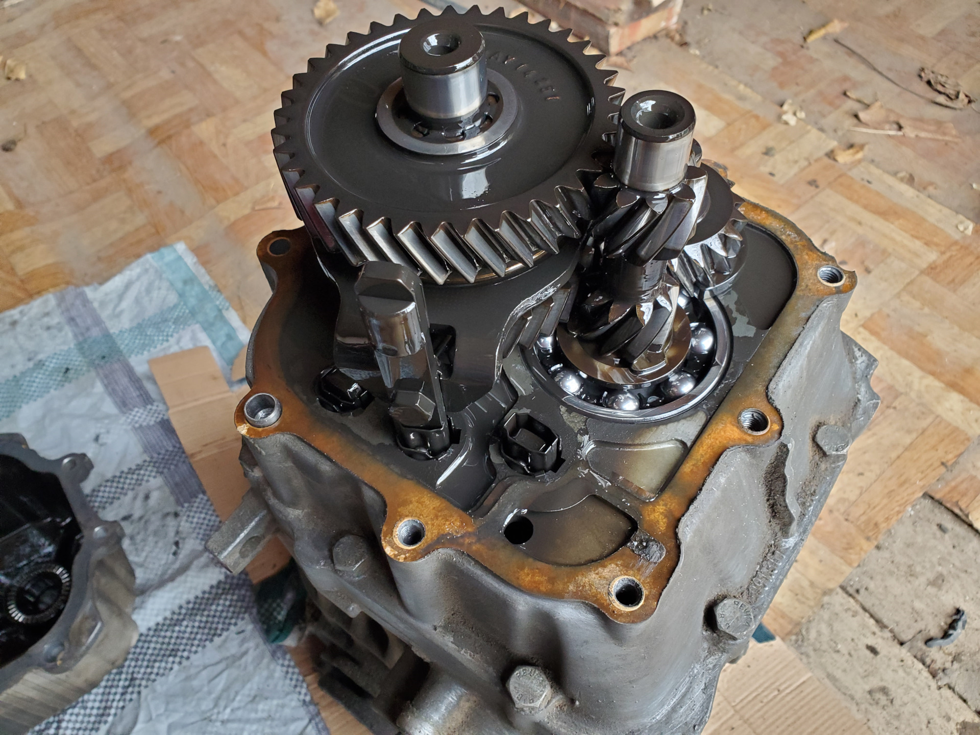 В общем, настроения копать дальше пропало, было решено установить запасную КПП. Но прежде чем её установить, снова разобрали, что бы осмотреть и установить на место стопорное кольцо, которое отсутствовало после предыдущего вмешательства мастера по коробкам. Отсутствие кольца подсмотрел у сломанной когда снял крышку 🙃