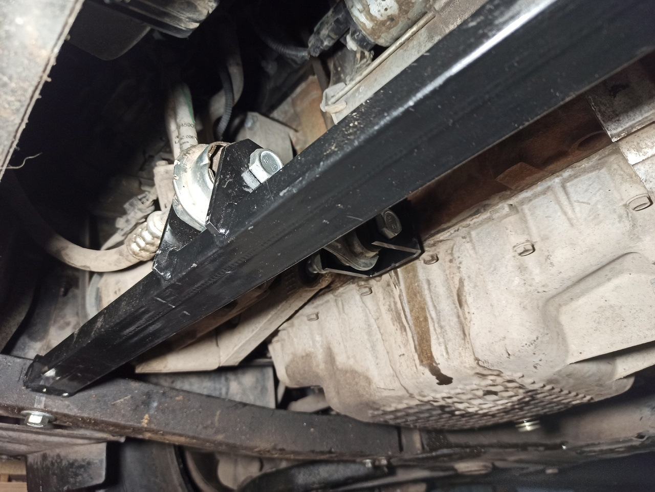 Кладём поперечину на лонжероны, наживляем гитару и отмечаем места отверстий. Для удобства и более точного сверления отверстий я снимал лонжероны. Т.к работа производилась в яме, шуруповертом не достать, а машину двигать туда-сюда не хотелось (одежда грязная).😄