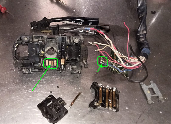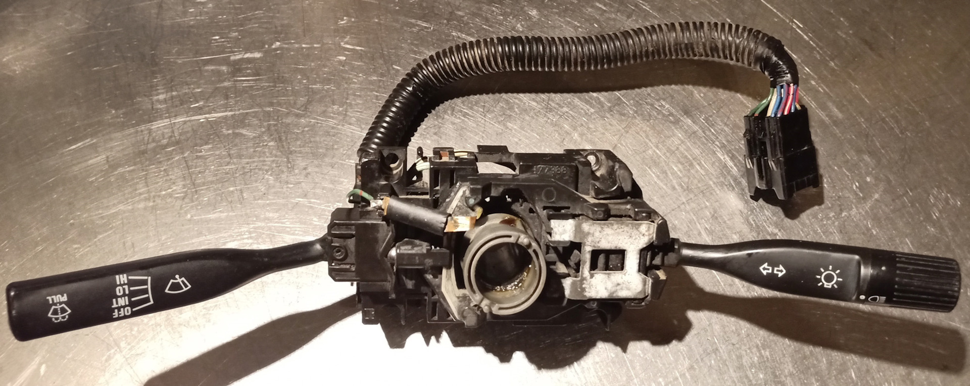 Был один с неизвестной историей, с затертыми надписями на рычагах, изувеченной пружиной возвращателя поворотников, неработающим контактом (одним из пяти в группе). Купил за 500 р. еще один с отломанными защелками, отсутствующей крышкой блока контактов, отсутствующим скользящим контактом звукового сигнала и проводами местами без изоляции. Также на этих двух были разные фишки. Собрал из двух один, ушло аж три часа, хотя я вроде не тормоз. Там все спаяно каким-то очень тугоплавким припоем.