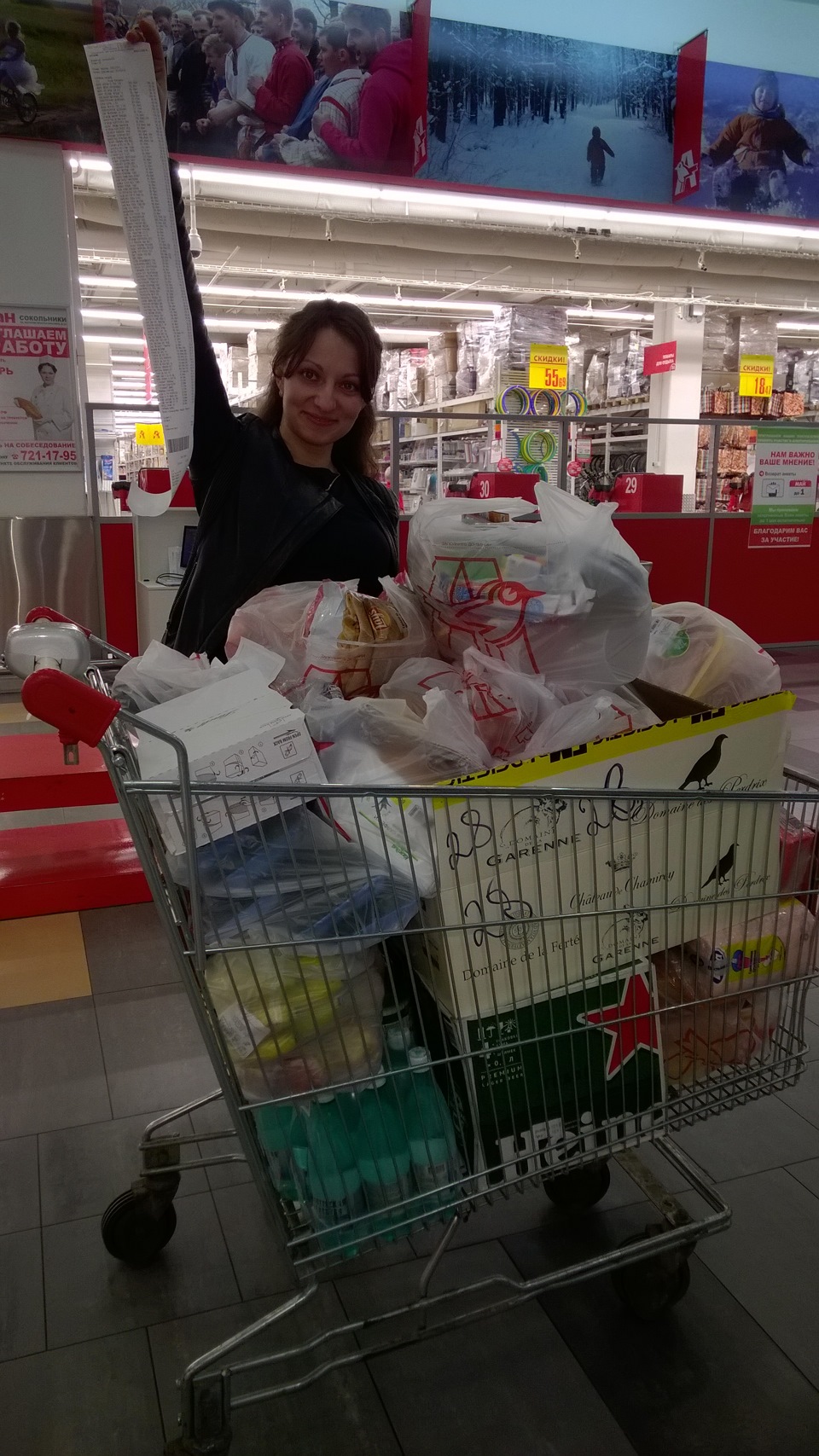 В четверг гоняли в ашан за продуктами для запоздалаго празднования ДР в воскресение. Отвратительное место. Ужасно. Все что то хватаеют, куда то несутся со своими тележками. Мерзко. Меня тошнит от подобных мест. Но увы, иногда приходится там бывать. Ни разу мне не доводилось покупать столько продуктов разом и на подобную сумму. Результат был таков: