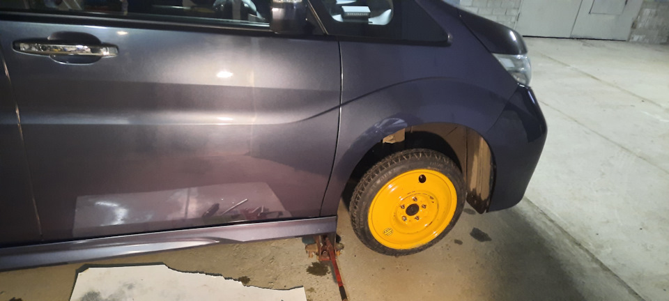 Ничего сложного нет. В первую очередь запаску назад ставим, а потом уже меняем спущенное переднее колесо.