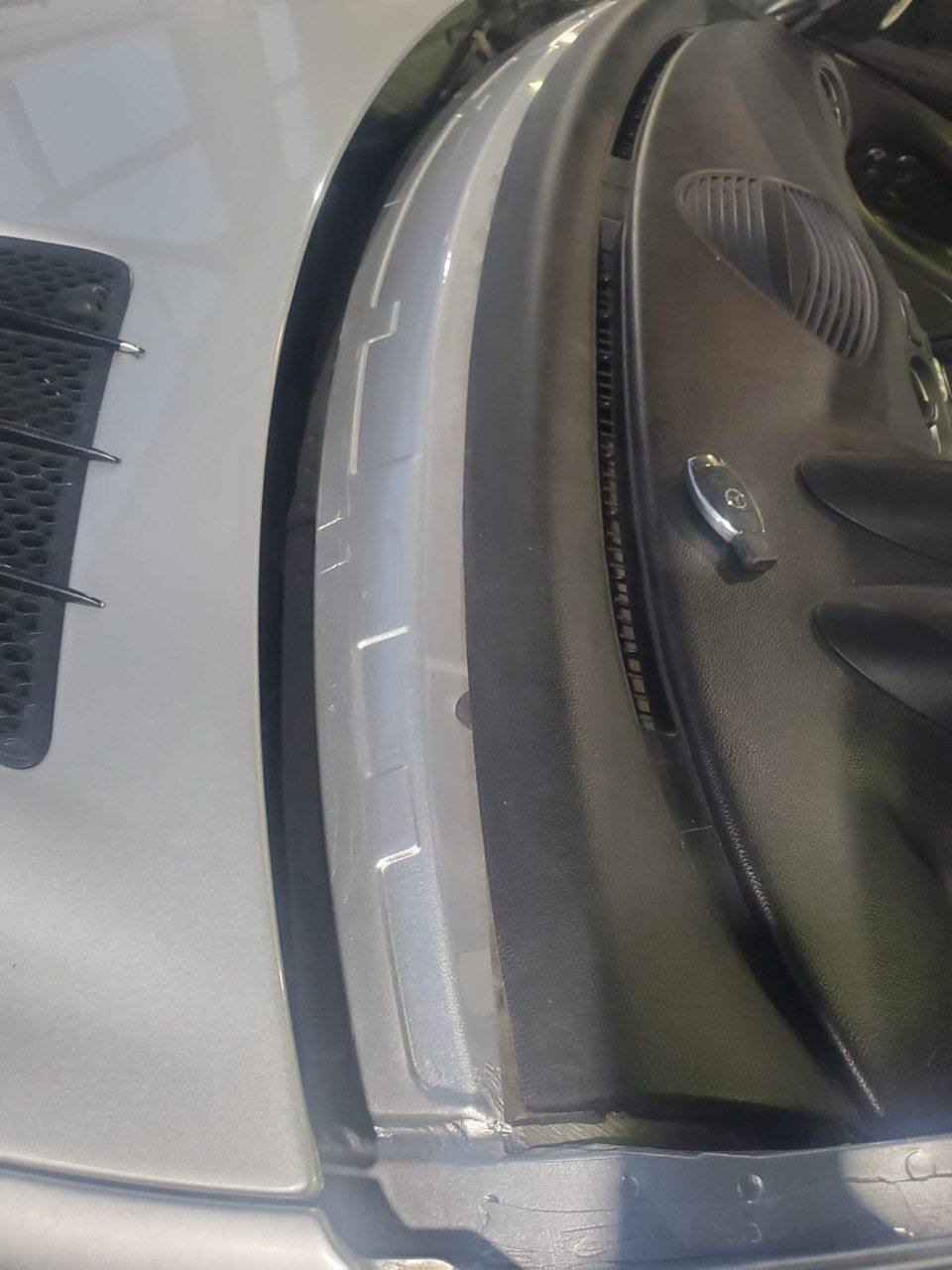 И так, для постановки Мерседеса на учет в СПБ было необходимо заменить лобовое стекло, оно было с трещинной. Раз уж полезли в эту степь, надо делать все в комплексе. На рамке вокруг лобового стекла присутствовали сколы, соответственно надо вылечить сколы. На планке которая прямо над лобовым стеклом вспучилась краска.