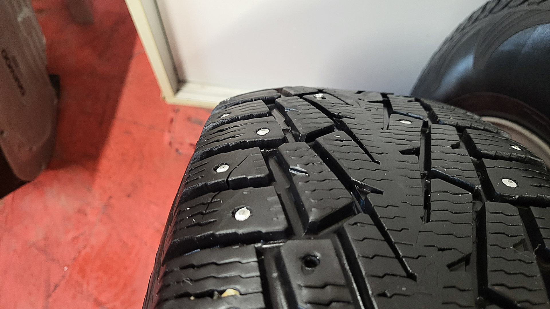 Так выглядит шипованая резина на которой наваливали с дикой скоростью по асфальту. Шип грелся и резина вокруг него перегревалась.