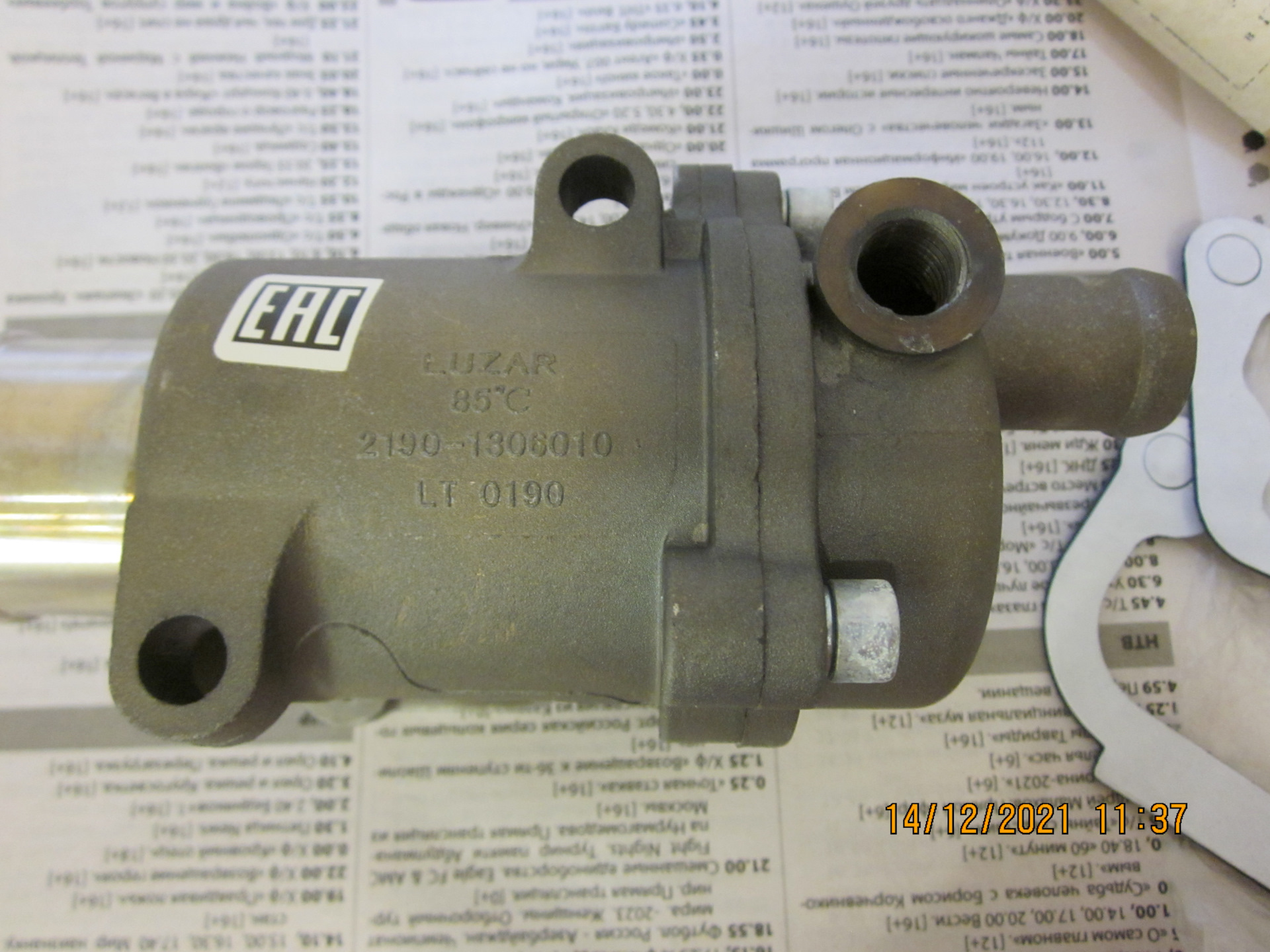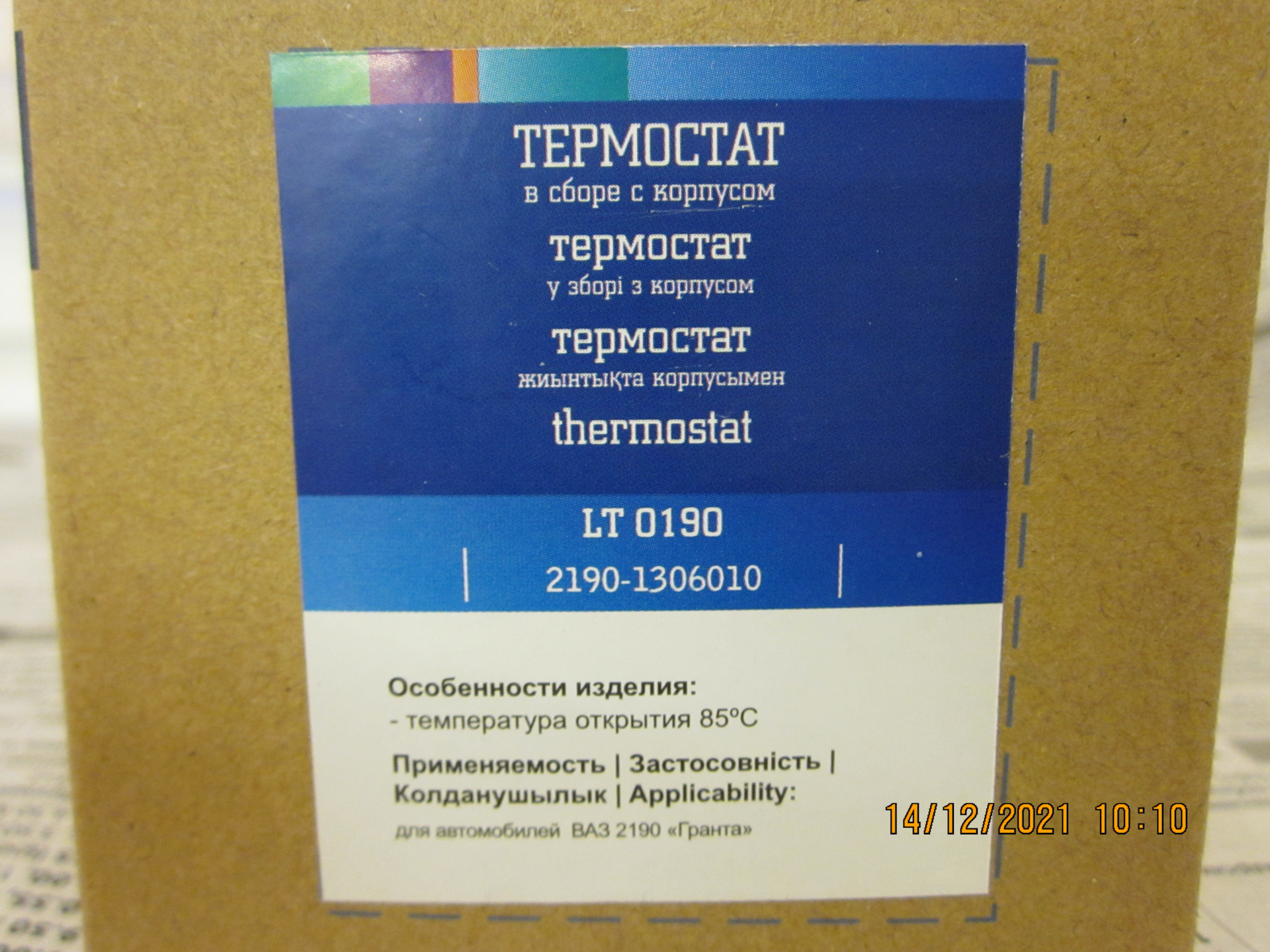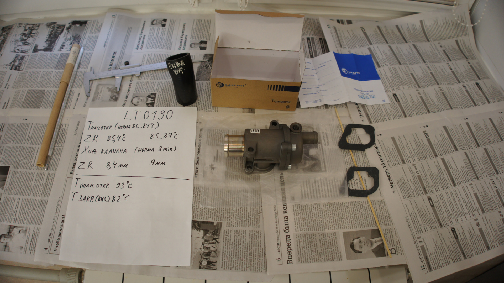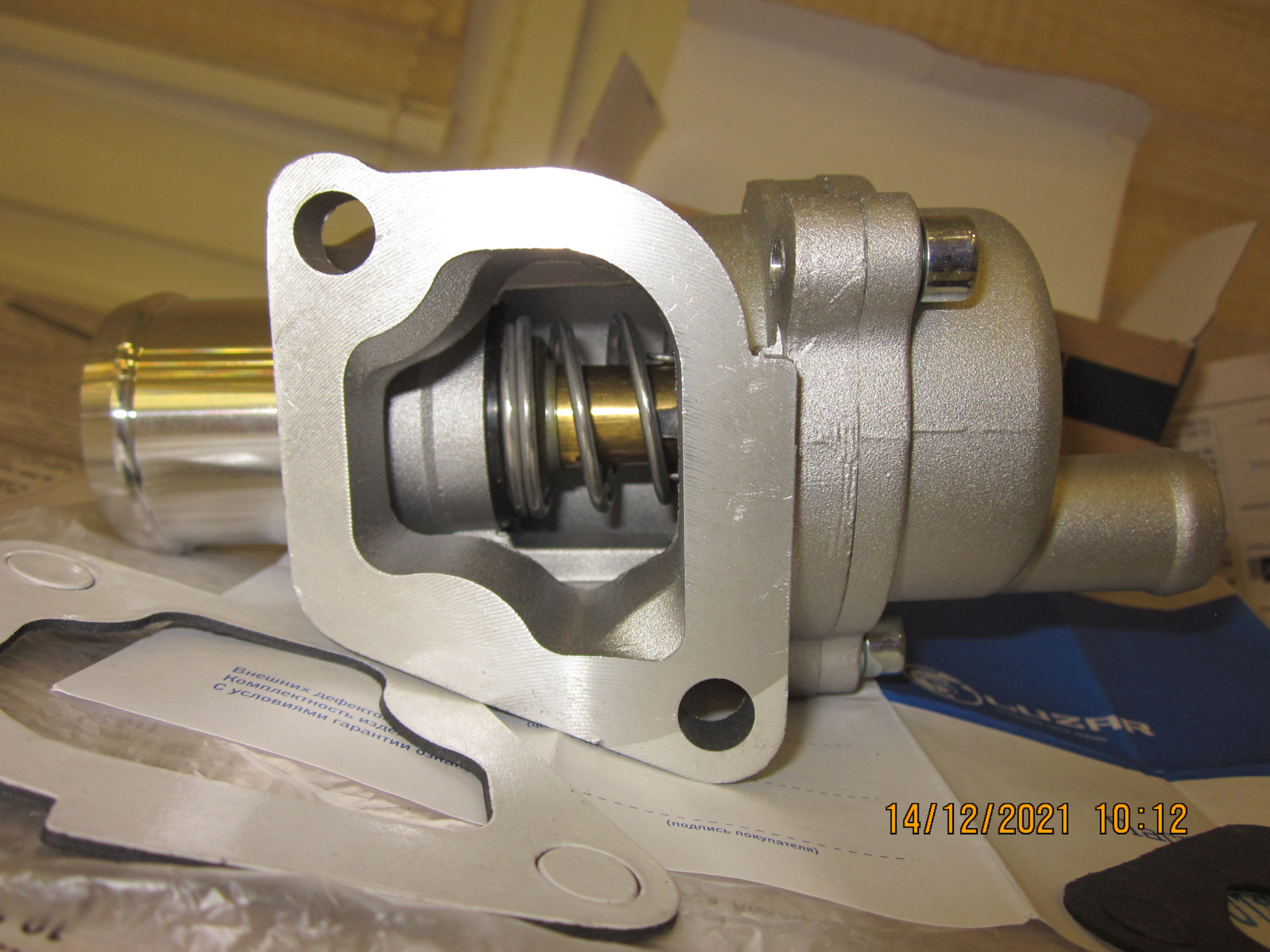Решено было по случаю заменить профилактически термостат. Изучив сравнительный тест от ЗаРублём www.zr.ru/content/article…1893-termostaty-i-pesets/, мой выбор пал на неоригинальный термостат LUZAR 85°С для Lada Granta, Kalina, Priora, Vesta, Datsun артикул LT0190. У него у единственного клапан был «обут» в резину, и он единственный был на 100% герметичен, за это он мне и приглянулся.