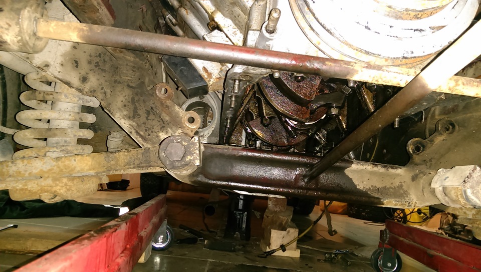 Вот пока ездил в командировку все стояло, но зато в Москве я прокатился на Газ-2424))) Пообщался с людьми, у которых есть настоящие Газ2424 и им подобные авто и получается, что кардан короче родного на 3,5см (123,5 см против 120,5 см — это только длина трубы), но еще выходит, что крепление трапеции АКПП скорее всего смещена назад))) в сравнении со стоком, т.к. убрав кардан и поставив АКПП в родное место на родную подушку, ДВС сидел близко к переду, пришлось перекинуть АКПП через трапецию и тогда он нормально сел). Скорее всего придется сделать переходную пластину под крепления АКПП. Теперь мотор сел хорошо — есть возможность его перемещать влево и вправо. Теперь дождусь прибытия коллекторов выпускных да поддона с ЗМЗ-505 и буду примерять уже с ними. И вперед — городить крепления подушек к балке…