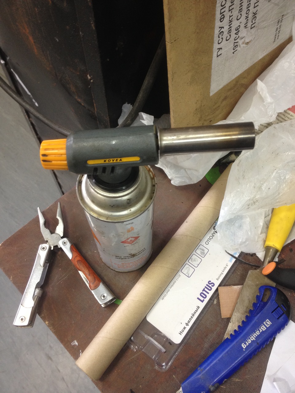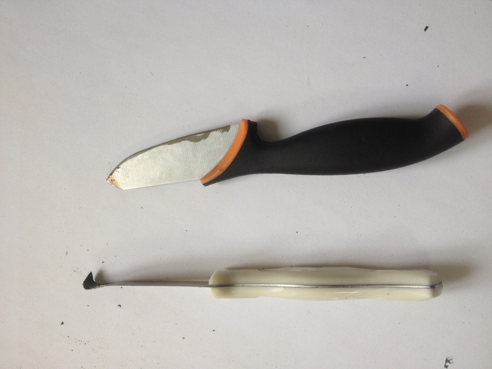 Первое, что надо было сделать — изготовить инструмент. Сперев из дома три ножа… шучу =) Купив в магазине три ножа… два я сломал =) Ну кто ж меня предупредил, что их надо греть =) Сбегал в машину за горелкой, нагрел кончик ножа и согнул его крючком… не так, да еще и не в ту сторону =)