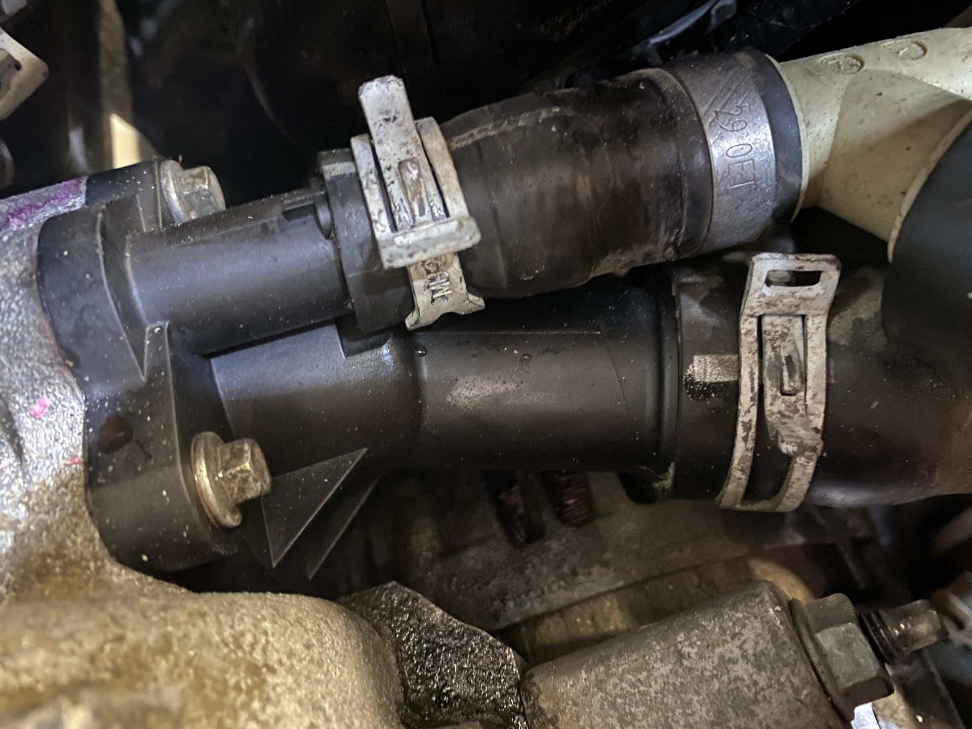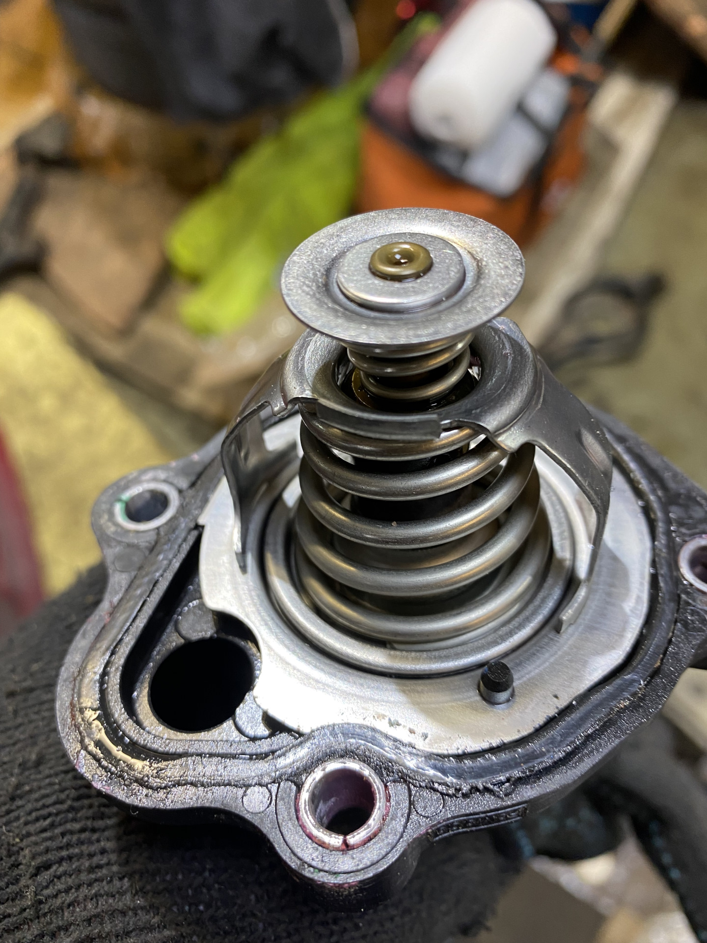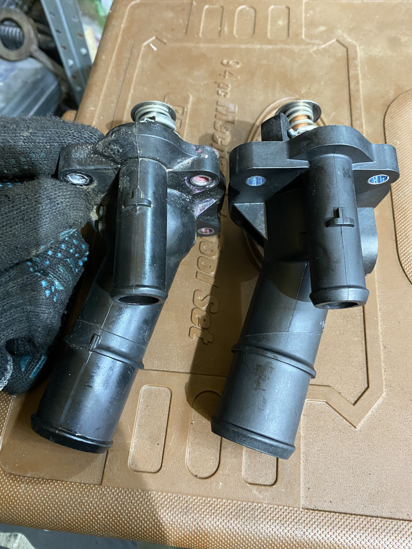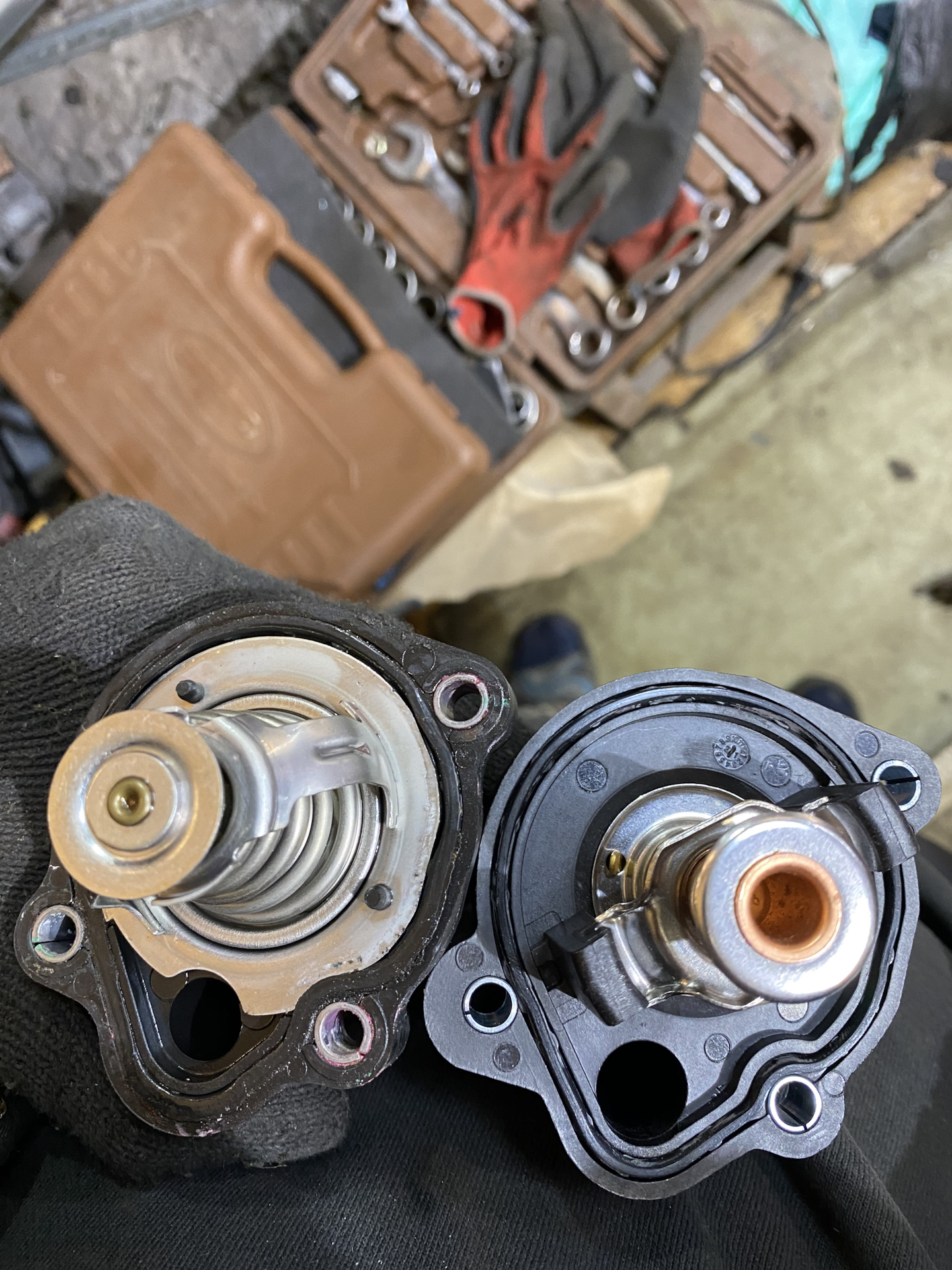 Далее при парковке чувствовался запах антифриза, начал выяснять откуда, и обнаружил подтекающую прокладку термостата, решил не ограничиваться только прокладкой, а заменить термос в сборе . Т.К. и сам элемент может сточиться и клинить, и пластиковый корпус термоса также может повести . Заменил на MOTORAD 51488K . При снятии старого, оригинального, обнаружил, что прокладка перестала быть прокладкой . Одновременно махнул и на новый антифриз.