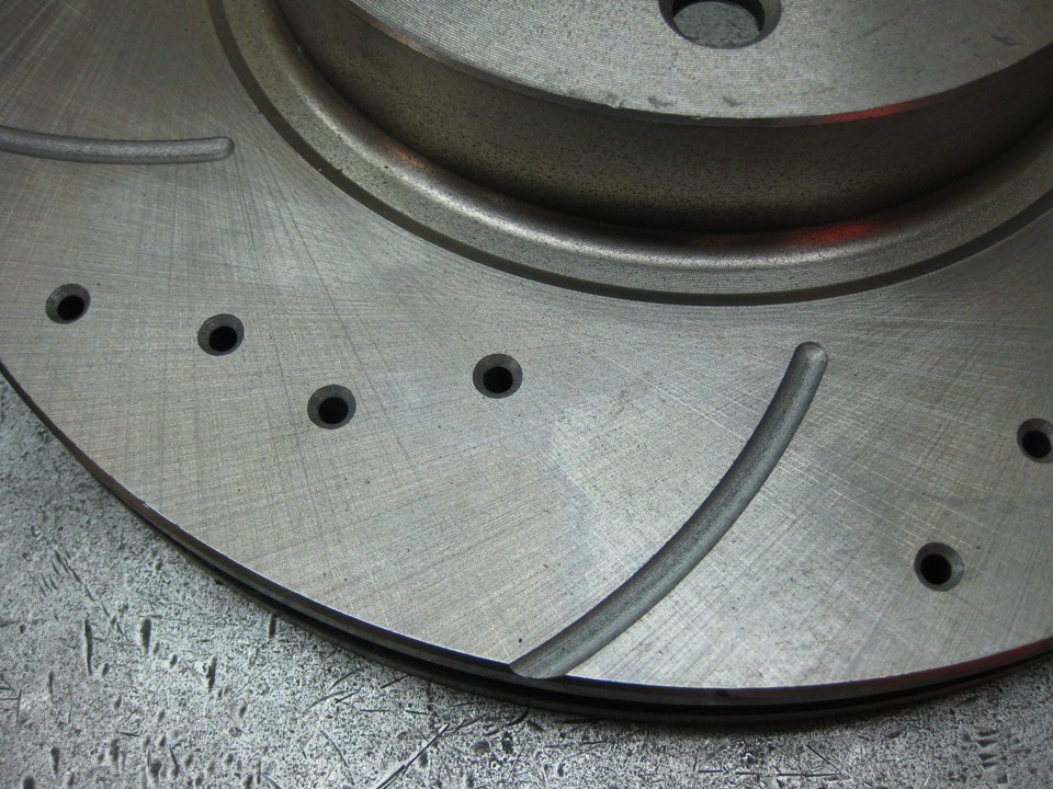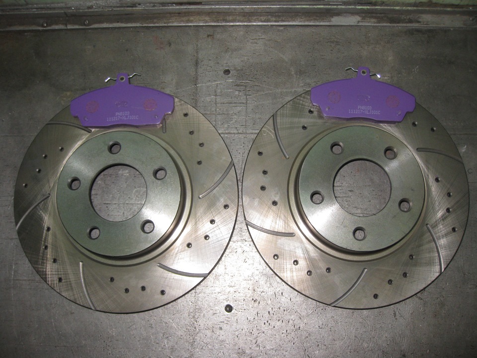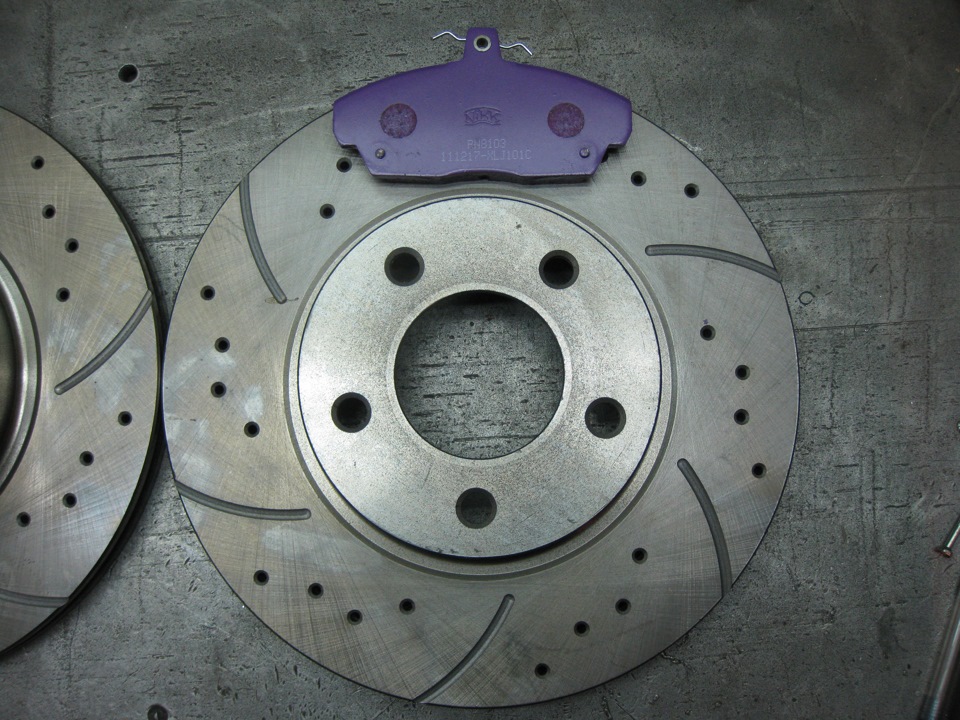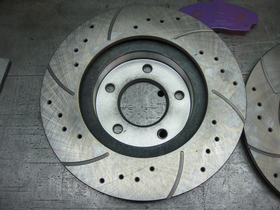 Диски купил направленные — правый и левый, перфорированные со слотами. Делают их вроде как в Дзержинске.