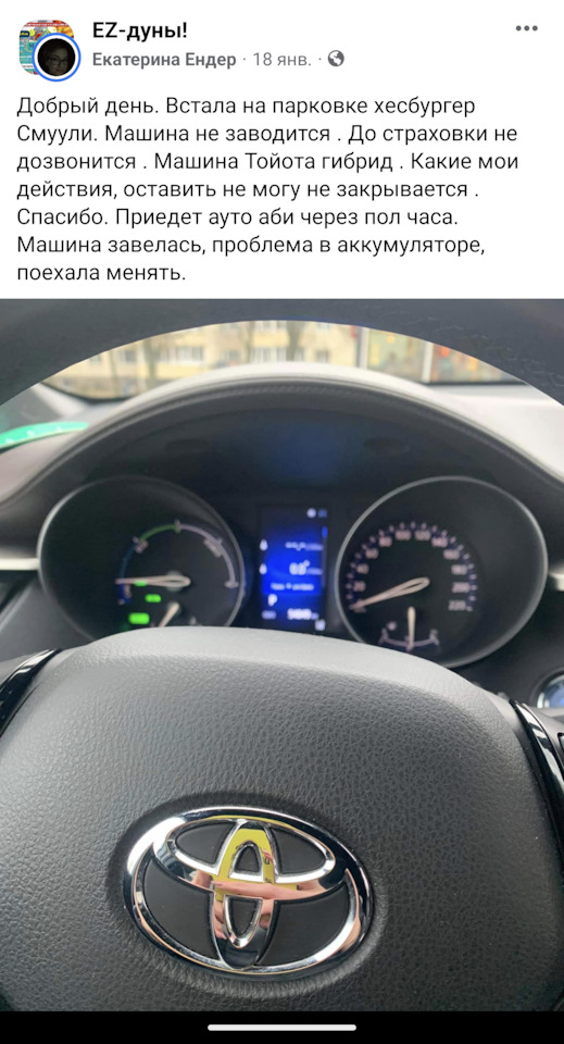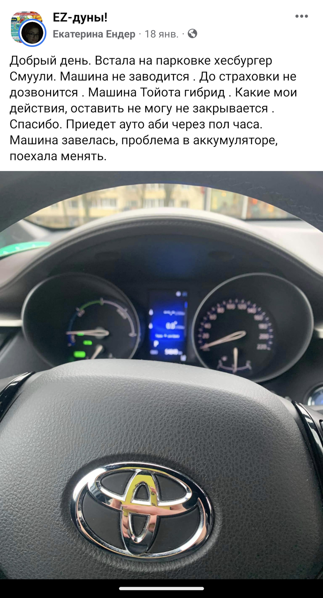 Звоню дилеру. Диалог: "Здравствуйте! У меня вопрос по поводу аккумулятора на гибридной Королле…*меня перебивает работник*, Вам нужна помощь, чтоб прикурить?" — даже дилер в курсе! В местной Фейсбук авто группе, сразу заметил несколько записей, с криком "Дайте прикурить!" именно от владельцев Гибридных Тойот.