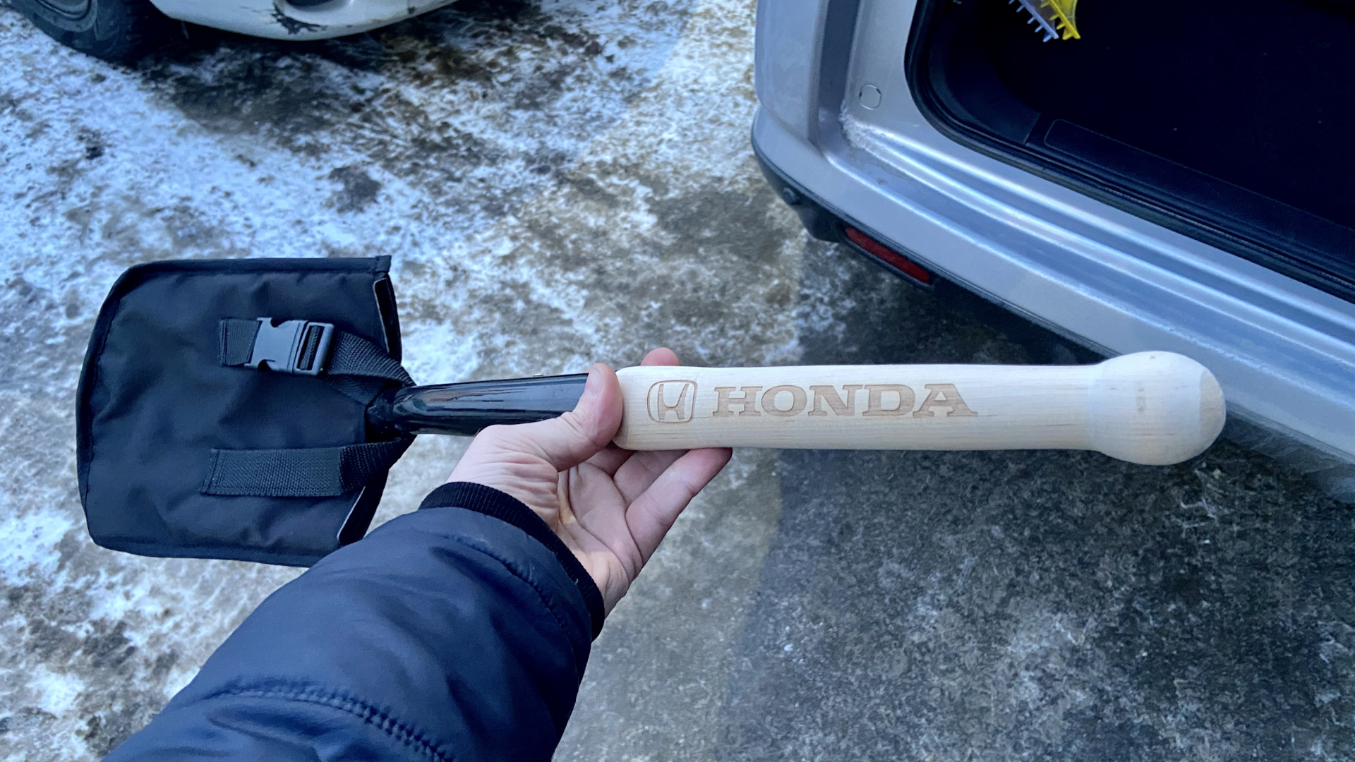 Размерчик не большой конечно, но удобно возить в багажнике и это лучше, чем пинать снег или землю ногами)))