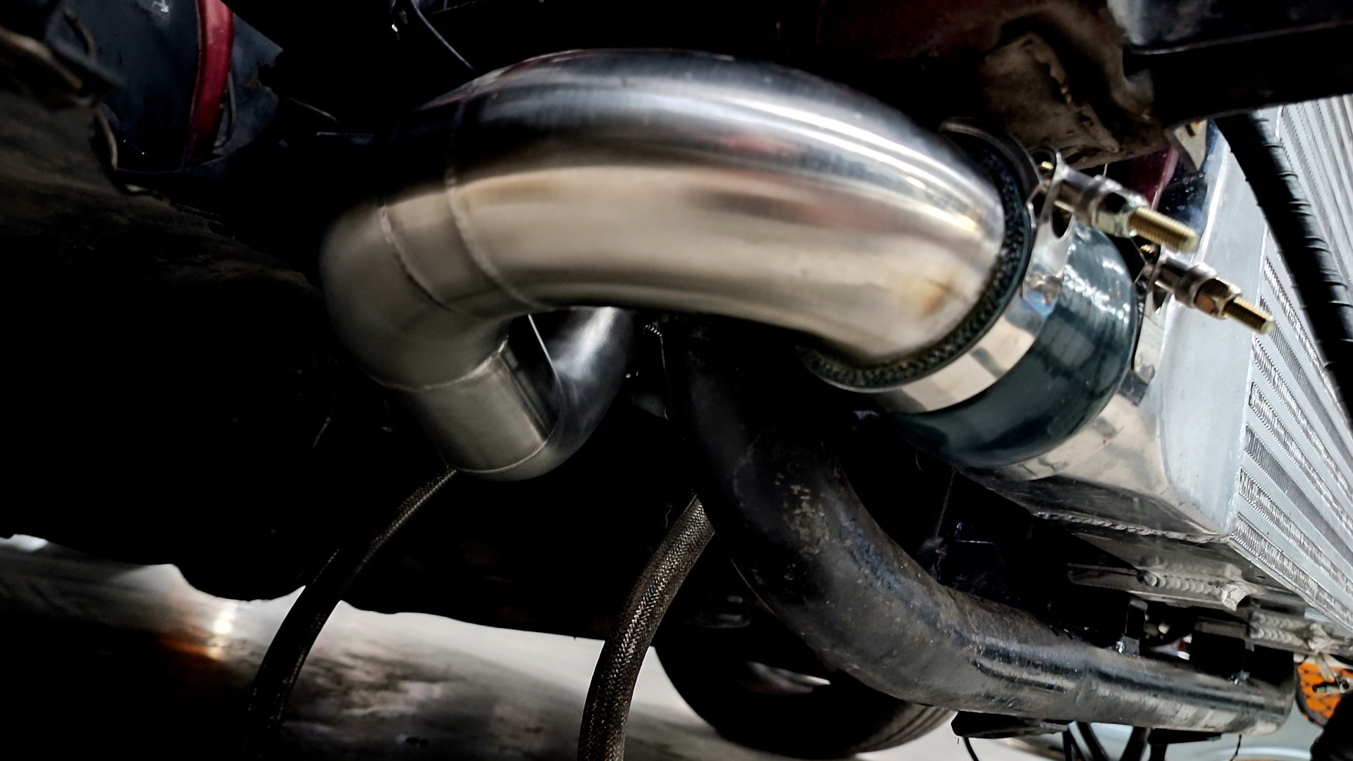 Пайп от турбины до интеркулера было решено изготовить из трубы 2.5 дюйма (63мм), поскольку выход с холодной части турбины около 50мм, а вход и выход на интеркулере внутренний диаметр 68мм. В этом случае до кулька большая труба ни к чему, а пайп от интеркулера до дроссельной заслонки уже из трубы 2.75 дюйма (70мм), потому что заужать сечение после выхода с кулька, когда дроссельная заслонка так же имеет внутренний диаметр 68мм, тоже нехорошо.