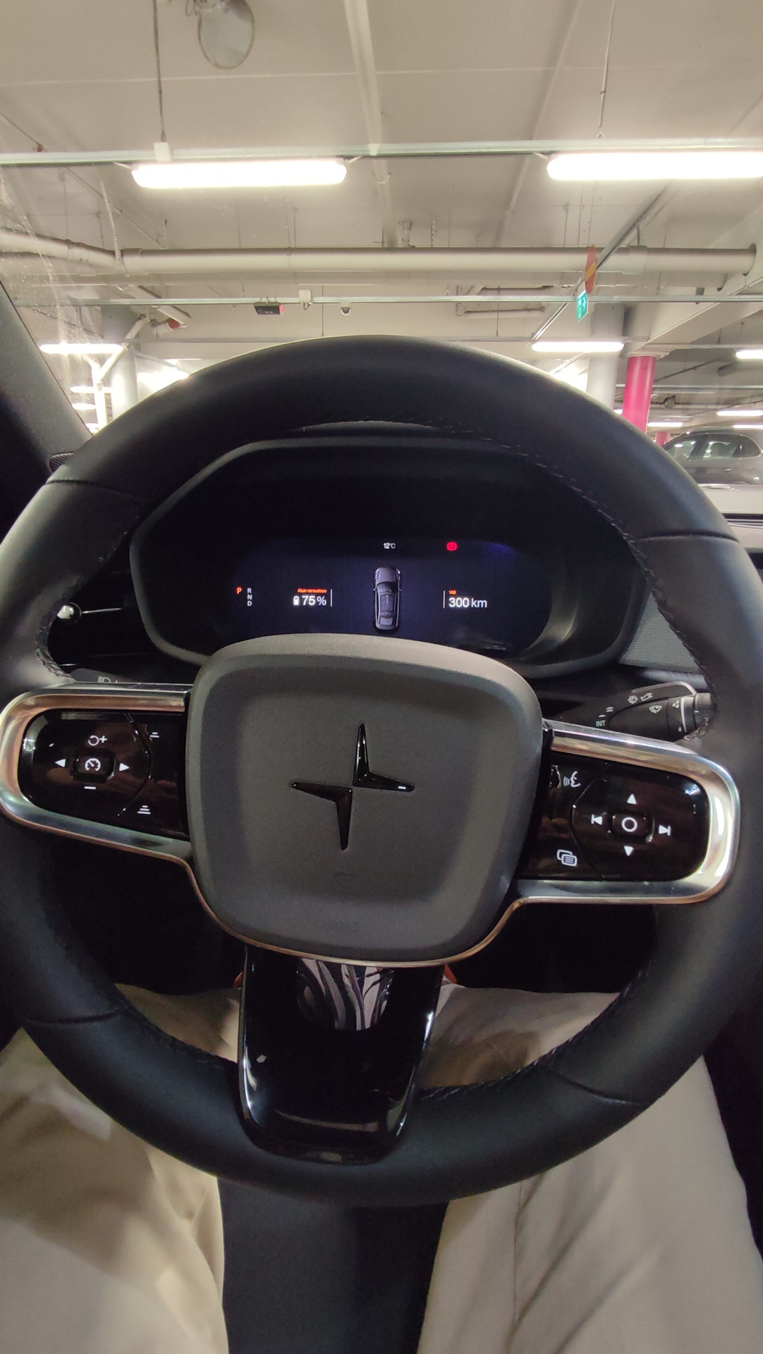 Ну что, поехали? Пристегните ремни, начинаем ускорение… Не впечатляет, возможно потому что ограничение скорости на этой улице 30 км/ч. (Я тестировал обычную версию Dual Motor, не Performance.) Для начала по совету менеджера выключил рекуперацию. В таком режиме Polestar едет ровно как бензиновый автомобиль. Он не тише (видимо у меня в Вольво хорошая шумоизоляция), не быстрее (ну разве что чуточку), не комфортнее. Но и не хуже! Весь пользовательский опыт как бы кричит — "я обычная машина, не пугайся меня!". Прокатились. Отлично! Врубаем рекуперацию в "щадящем" режиме. И сразу же клевок, другой — как будто бросил сцепление на механике. Не очень комфортно. В режиме полной рекуперации эффект ещё более грубый. Кто знает — это фишка Polestar или всех электричек, так укачивать пассажиров? Не понравилось, хотя в одну педаль ехать прикольно. Выезжаем на трассу. Адаптивный круиз работает плавно, снижая скорость и разгоняясь где надо. А вот Pilot Assist очень раздражает постоянными подруливаниями. У кого он есть на Volvo — так же себя ведёт? BLIS оказалась очень полезная штука.