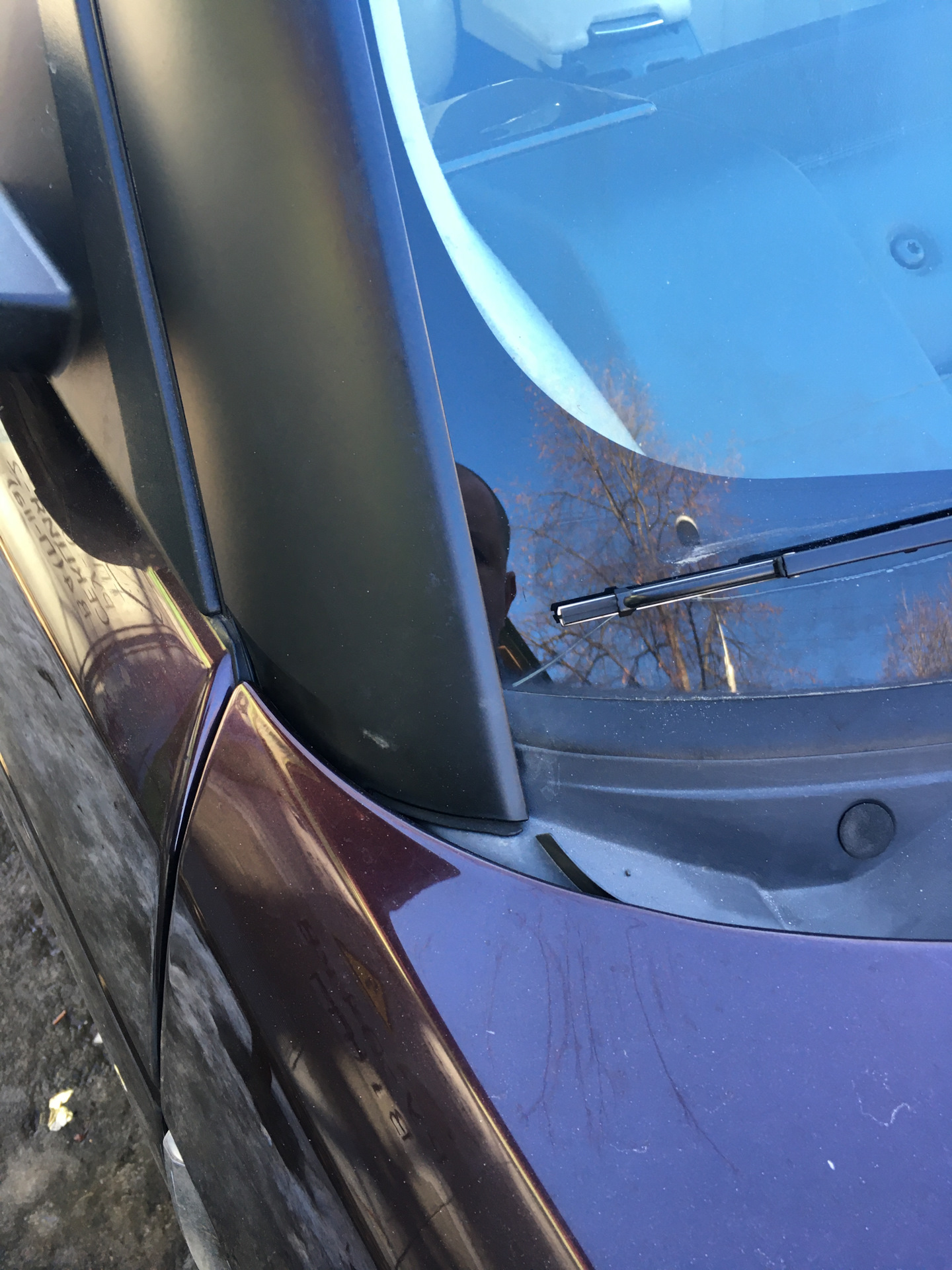 Протер стойку, открыл капот (чтобы нижний край молдинга корректно и беспрепятственно соприкоснулся с низом стойки) и установил молдинг, направив уже имевшиеся крепежные элементы в соответствующие отверстия, снаружи стойки и смелым и уверенным движением, с усилием, защелкнул на боковой панели. Отверстия с внутренней стороны совпали идеально, чем я и воспользовался, заполнив их крепежными элементами в виде специальных для этого дела пистонами.