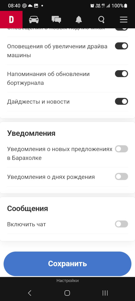 Не работает отключение уведомлений. Могу отключить только барахолку и дни рождения, остальное не реагирует на "тап"