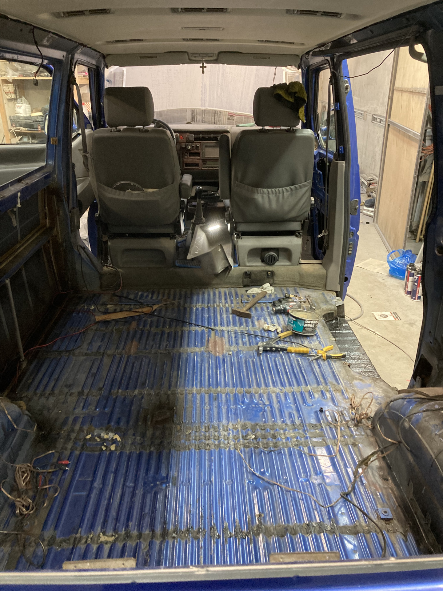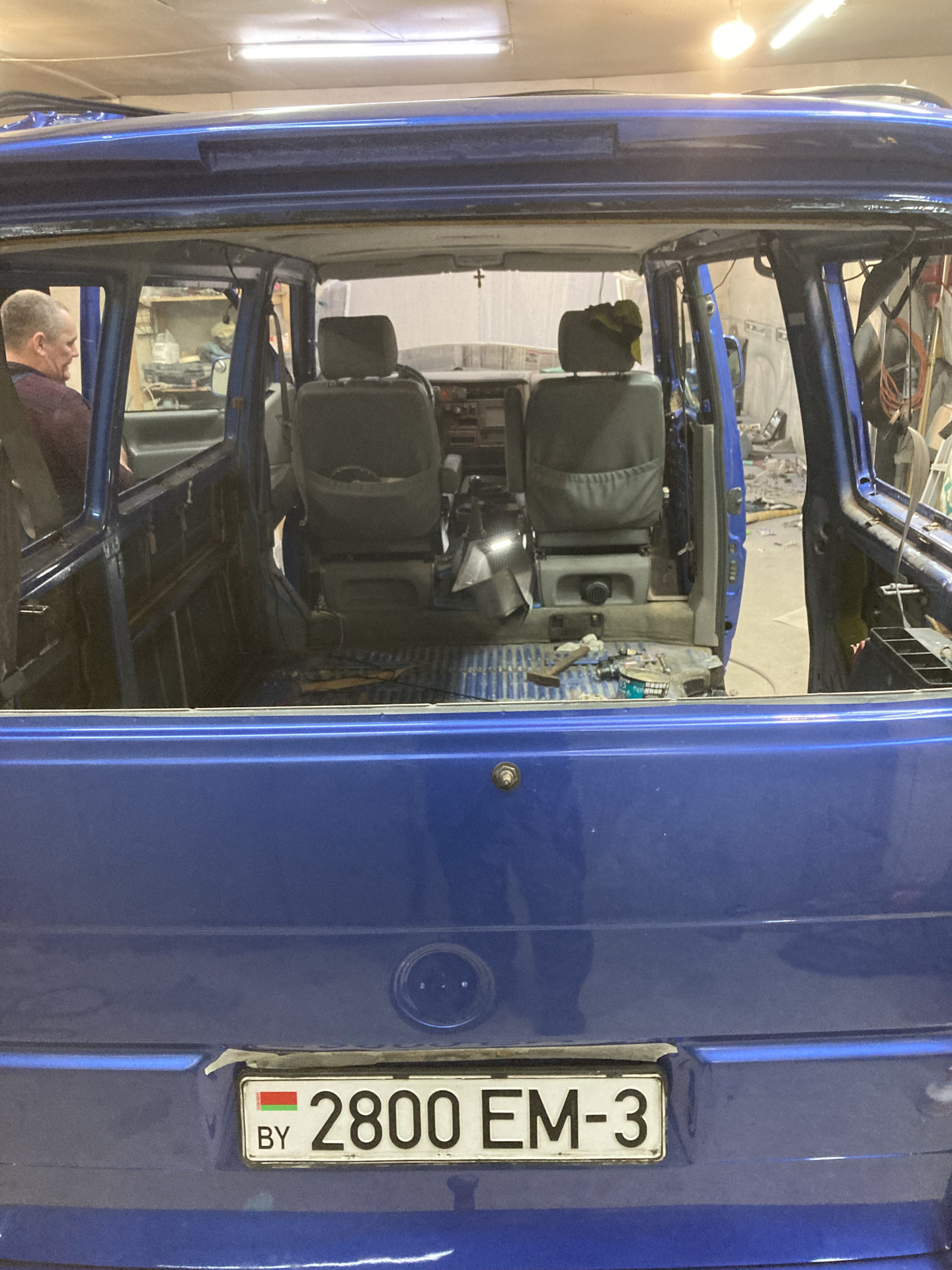 Были отмыты обшивки которые не перешивались, помыт пол, обрабатывали динидролом.Ждём сварщика сейчас что бы приварил металлические пластины в пол для сиденьев. Заказал на алике до покраски буса светодиодную подсветку номера.