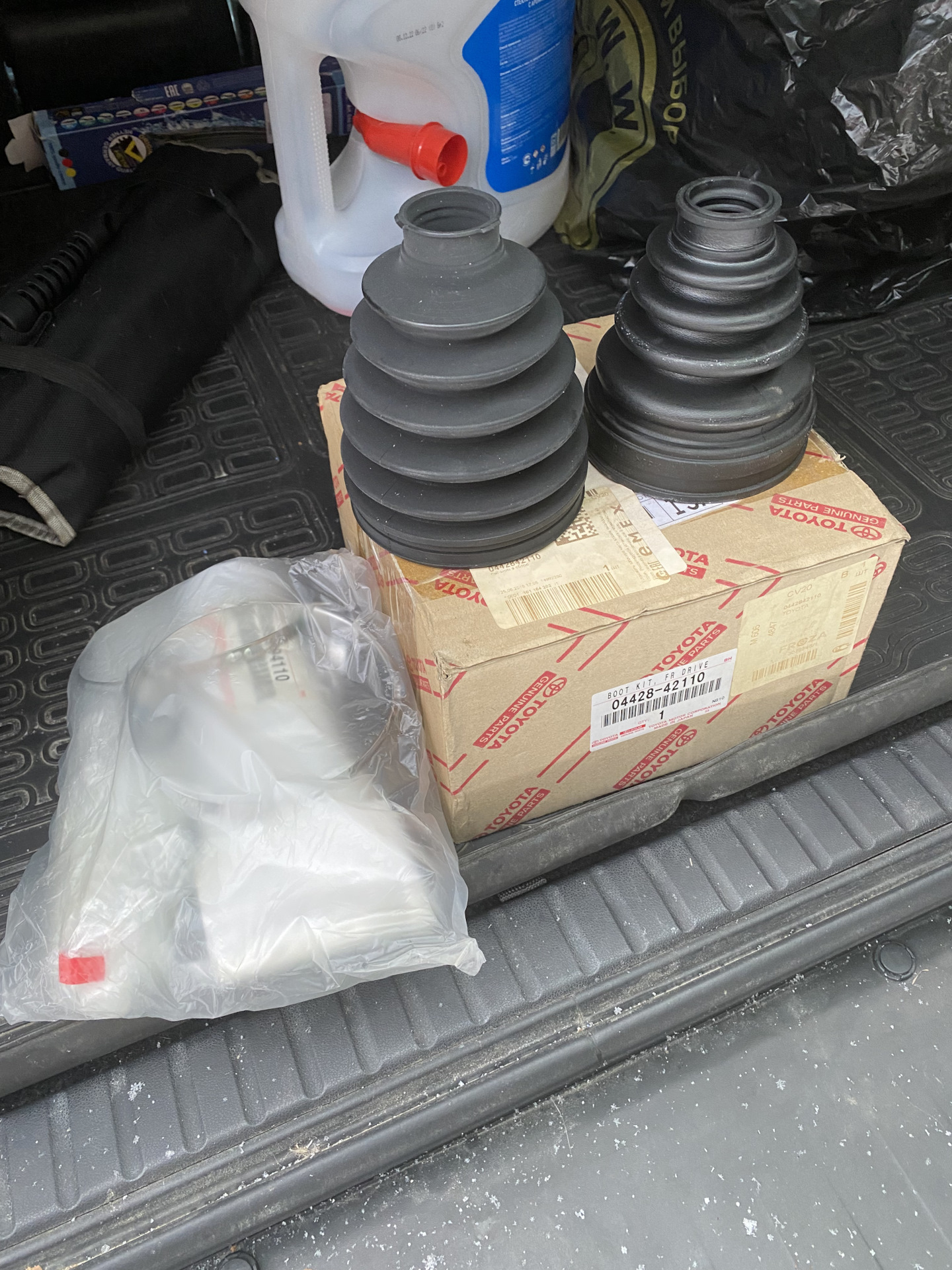 На диагностике также нашли дырочку на левом внутреннем пыльнике ШРУСа. По наличию нигде не нашел достойных аналогов, а буквально через несколько дней надо было ехать в Нижний Новгород, так что решил взять оригинал — 04428-42110 — 5 800,00 ₽. Он идет комплектом (внеш+внутр+хомуты+2 комплекта смазок).