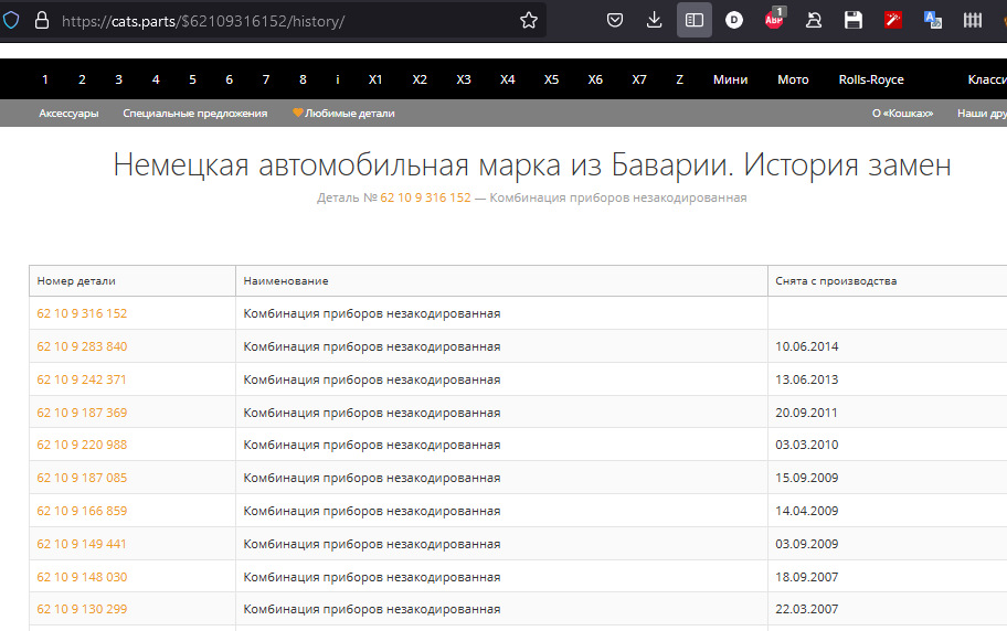 Внизу есть кнопка — История замен — и тогда показываются все номера деталей, которые когда-либо использовались.