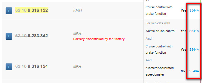 и там есть все номера всех приборных панелей — в километрах, милях, под активный круиз и без него. Хотя и на cats.parts тоже что-то по опциям есть. Но у bmwfans "кнопка" опции — активная, нажав на неё — мы получаем полный список оборудования, нужного для данной опции :)