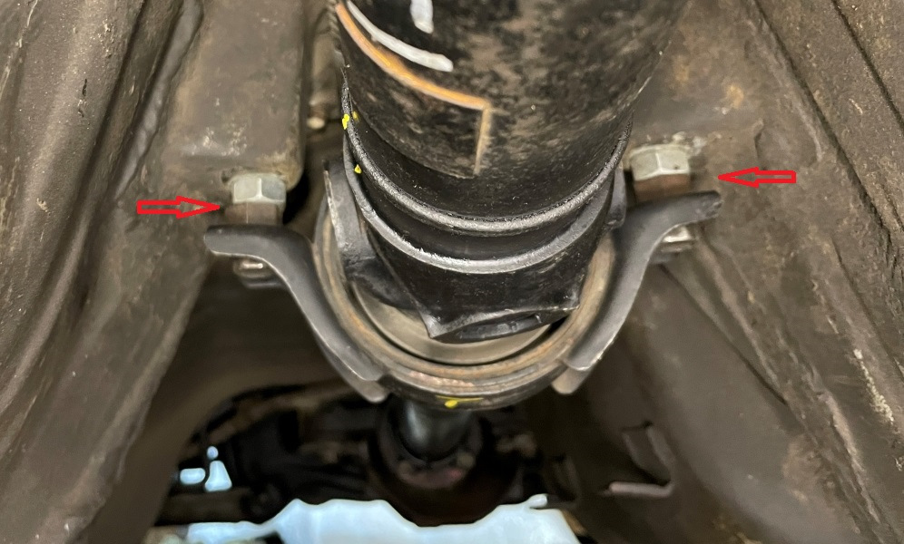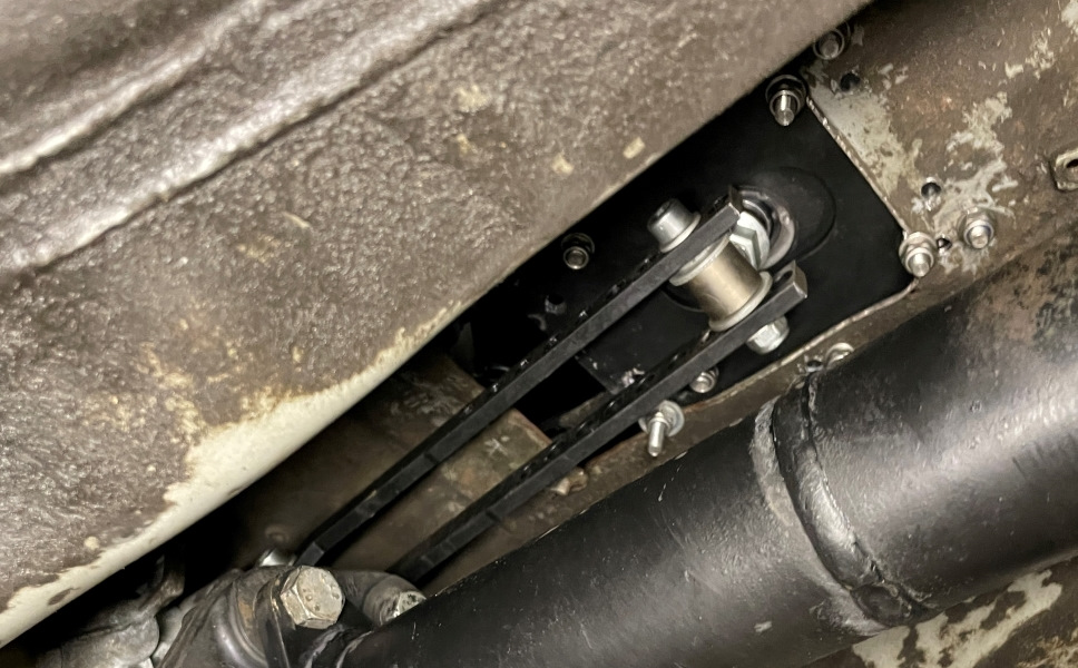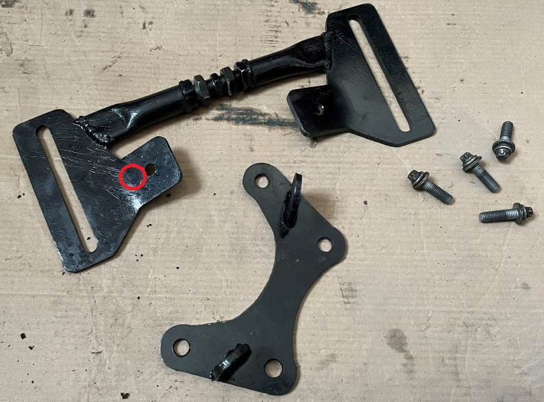 Что касается траверсы. Вернемся к ней. Состоит она из двух половинок. Так вот, после небольшого квеста этой запчасти, её удалось подогнать под кузов и закрепить. А вот коробка не вставала. Не задача. По правой стороне подушка встала как положено. А по левой подушка не встает в свое посадочное место. Крутили, вертели, так ничего и не придумали. Оказывается, была погрешность левой половинки траверсы. Если подогнать её под подушку, она не прикрутится к кузову. Ну и наоборот — подгоняешь под кузов, не бьет по подушке. По итогу подогнали траверсу под кузов и просверлить другое отверстие, чтоб закрепить подушку. Красным кружком обвел, где просверлил. Ничего сложного, но на это мы потратили не мало времени.