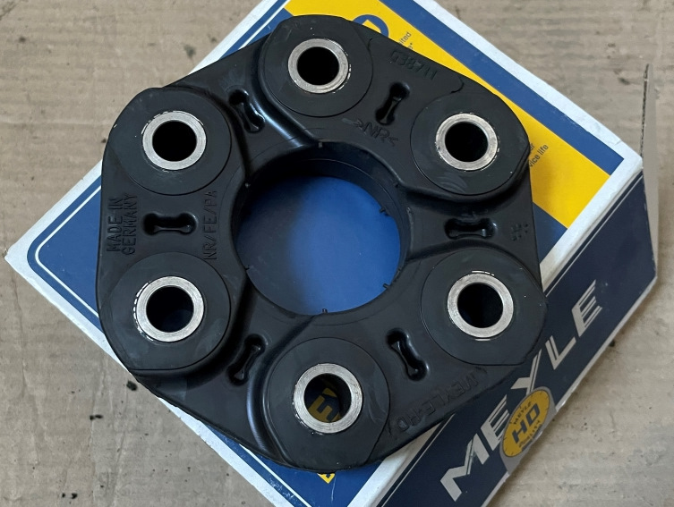 Эластична муфта КПП. Не стал брать алюминиевую с сайлентблоками, ограничился новой, резиновой, производства Meyle. Посмотрим, как она себя покажет. Я впервые сталкиваюсь с эластичной муфтой, и чтоб натянуть ее на концевик коробки, затем еще наживить кардан, пришлось изрядно помучаться и проявить смекалку. Не знаю, должно ли так быть или нет. Муфта подобрана верно, большая. Насколько мне известно, их два вида — большая и маленькая. Когда искал кардан, я ездил со своей муфтой и имея представление, что такое шлиц под малую муфту выбирал себе кардан.