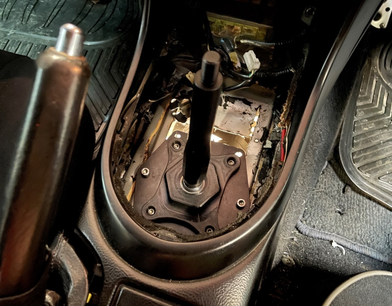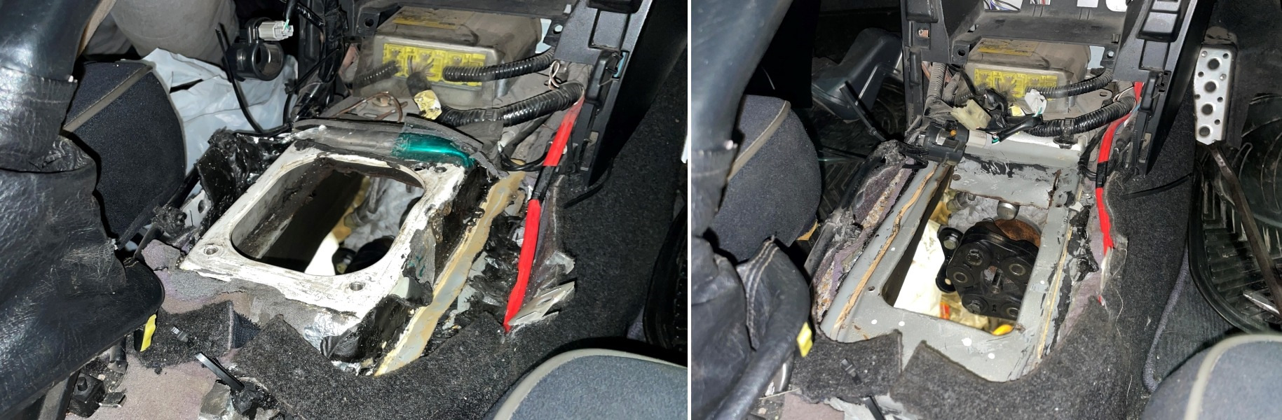 Машина у меня с завода автоматная. Когда ее собирали на 3s-ge и j160, распилили туннель, и установили заводкой подиум (тот, что слева на фото) под пыльник кулисы МКПП. Когда я поставил приобретенную кулису под BMW коробку, она встала очень высоко. Мне не нравятся длинные кулисы. Маленько подумав, я решил демонтировать этот подиум со своего туннеля, тем самым выиграть сантиметра три. Хорошо, что этот подиум был приклеен на герметик.