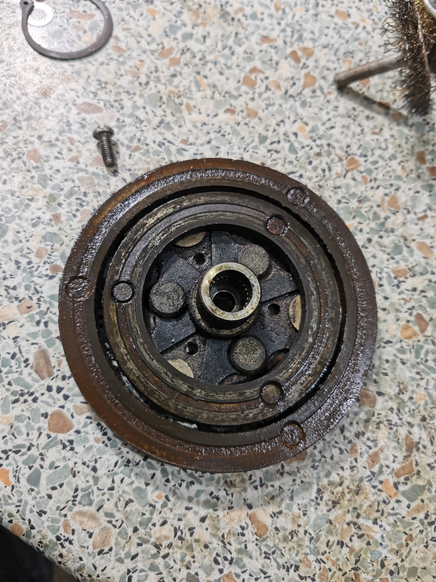 С включением кондея подшипник полностью блокируется (магнитом) и вращается вместе со шкивом и фланцем. Может где песком забило. Попробуй карбом внутрь и воздухом продуй. но лучше снять фланец для этого, он на шлицах и вычистить. у меня вроде на фото видно сколько там всякой бяки. Но это мли мысли, возможно ошибаюсь