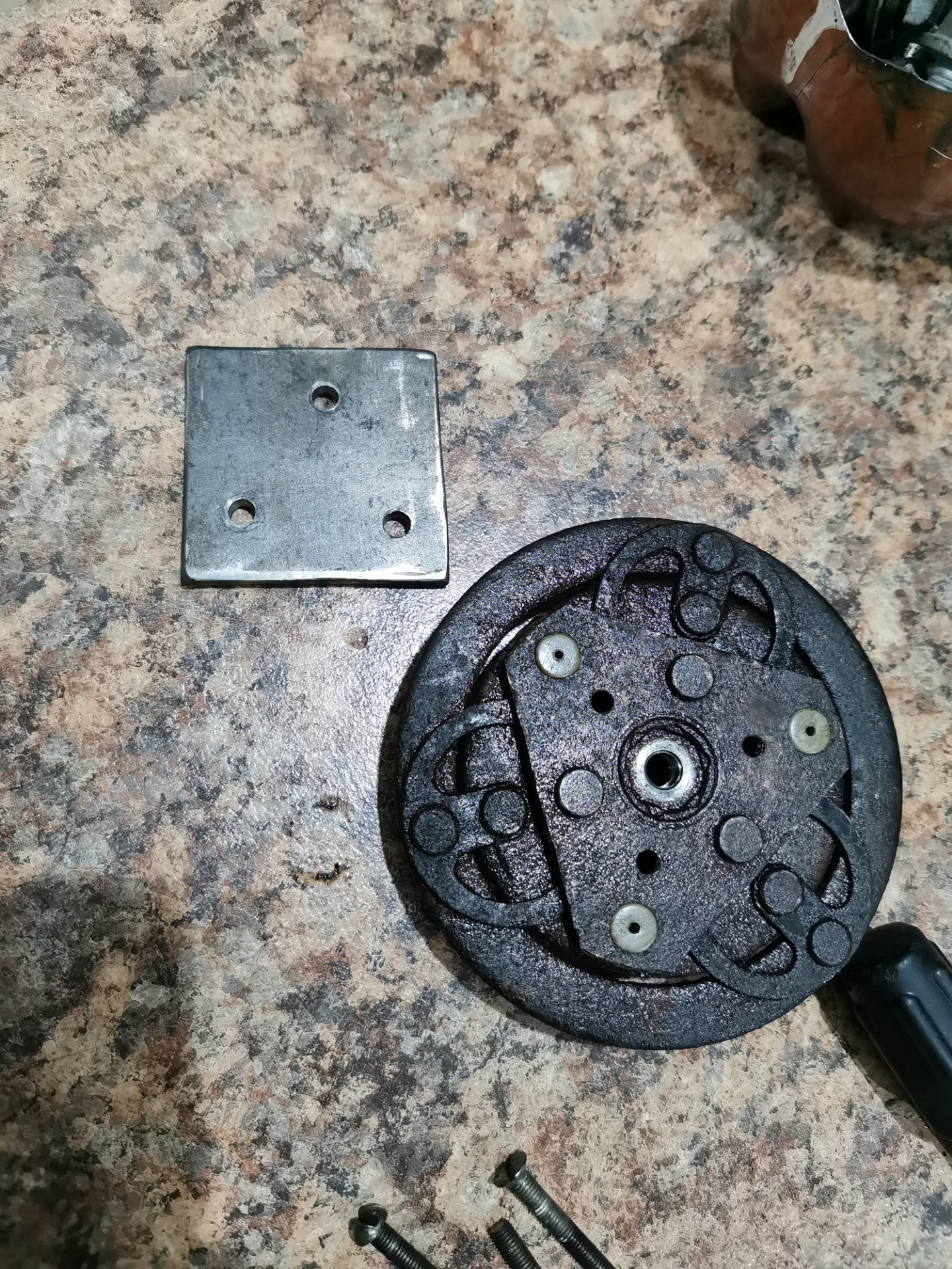Но фланец снять такое себе дело, когда нет съемника. Но смекалку и самодельные приспособления никто не отменял. Пластина, 3 отверстия в размер, закручиваем центральный болт до упора. Сверху самодельная пластинка и тремя болтиками поочередно выпресовываем. Фланец на столе, ржавчины дофига.