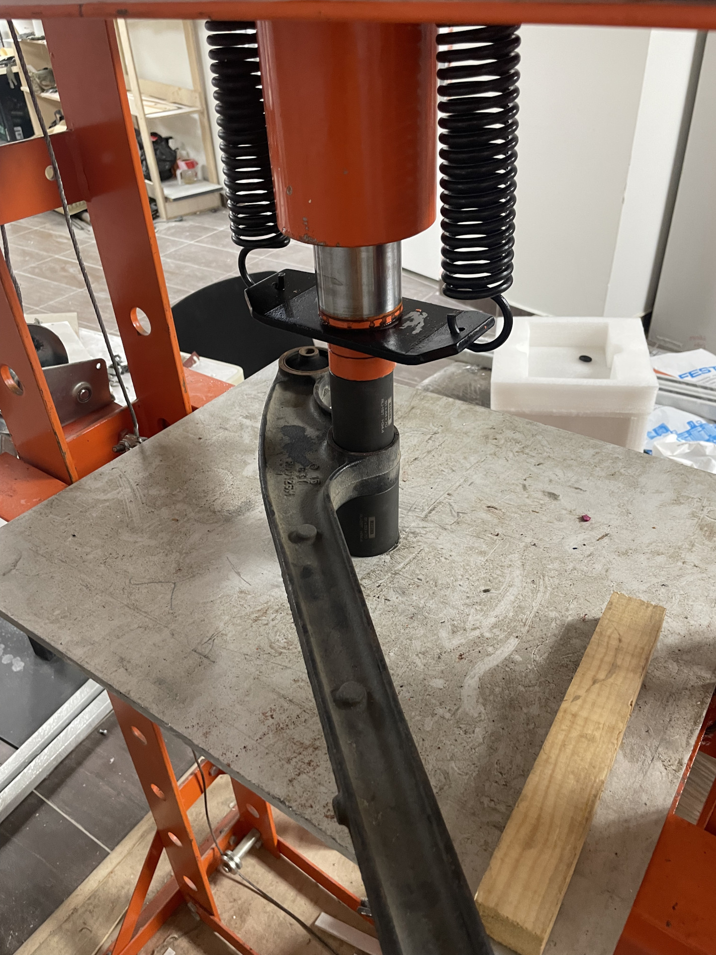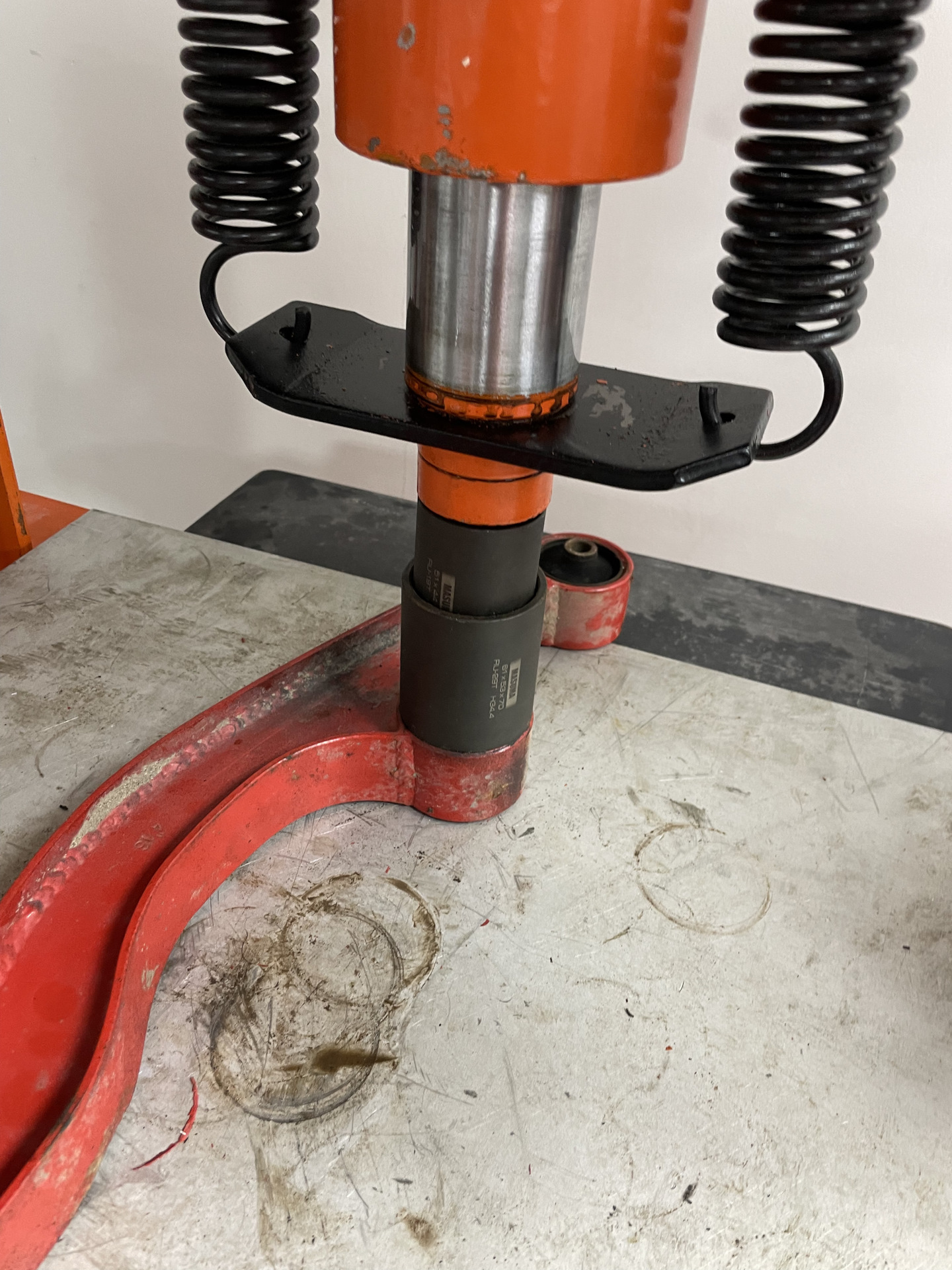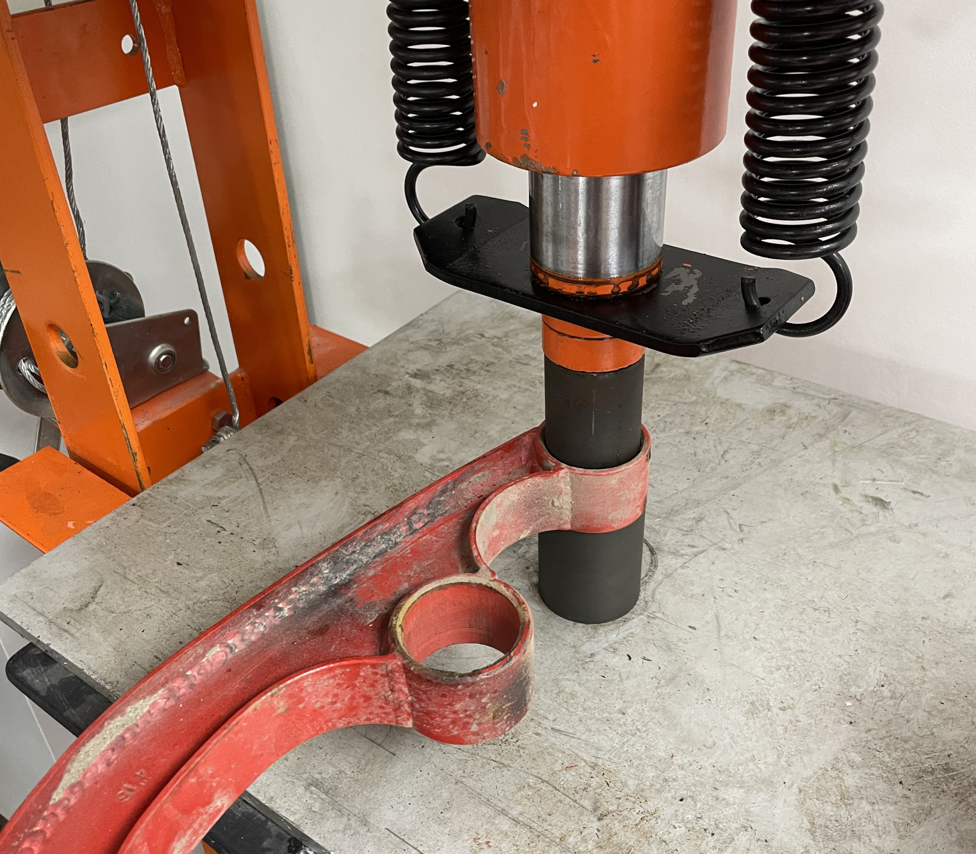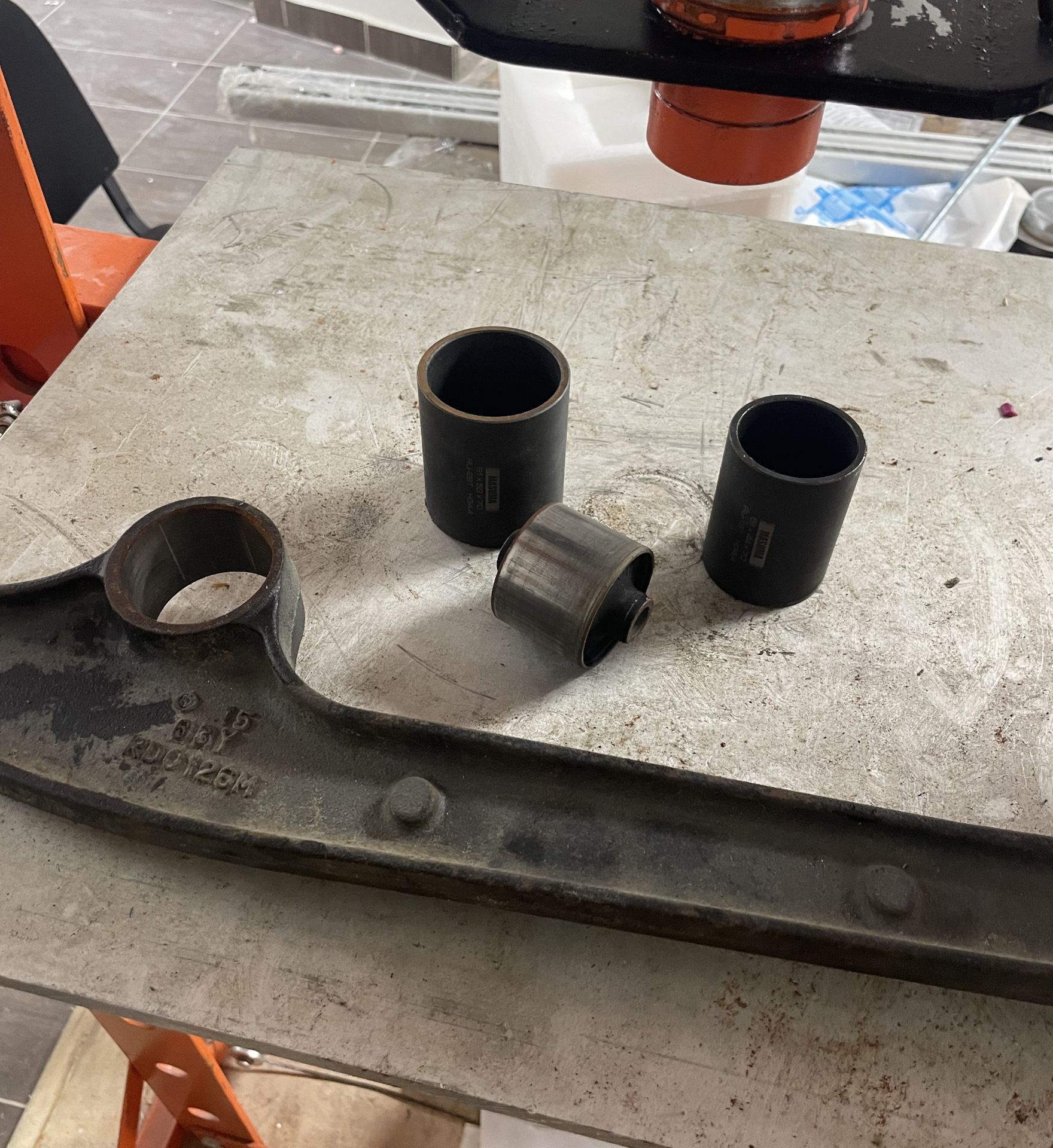 Вечером после работы выпрессовал из красных рычагов сайлентблоки. По процессу все просто, одну оправку под рычаг, другую сверху и давим.