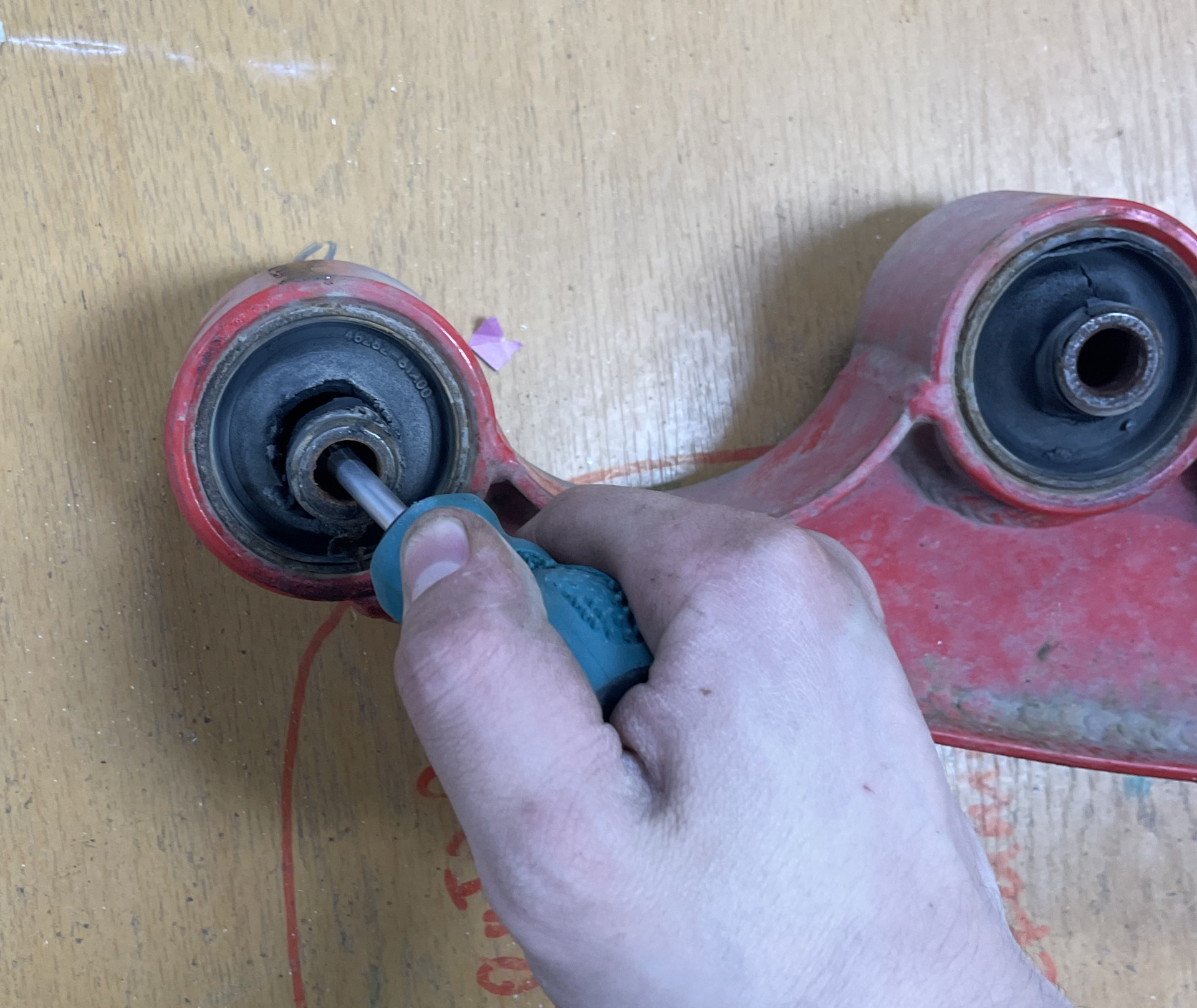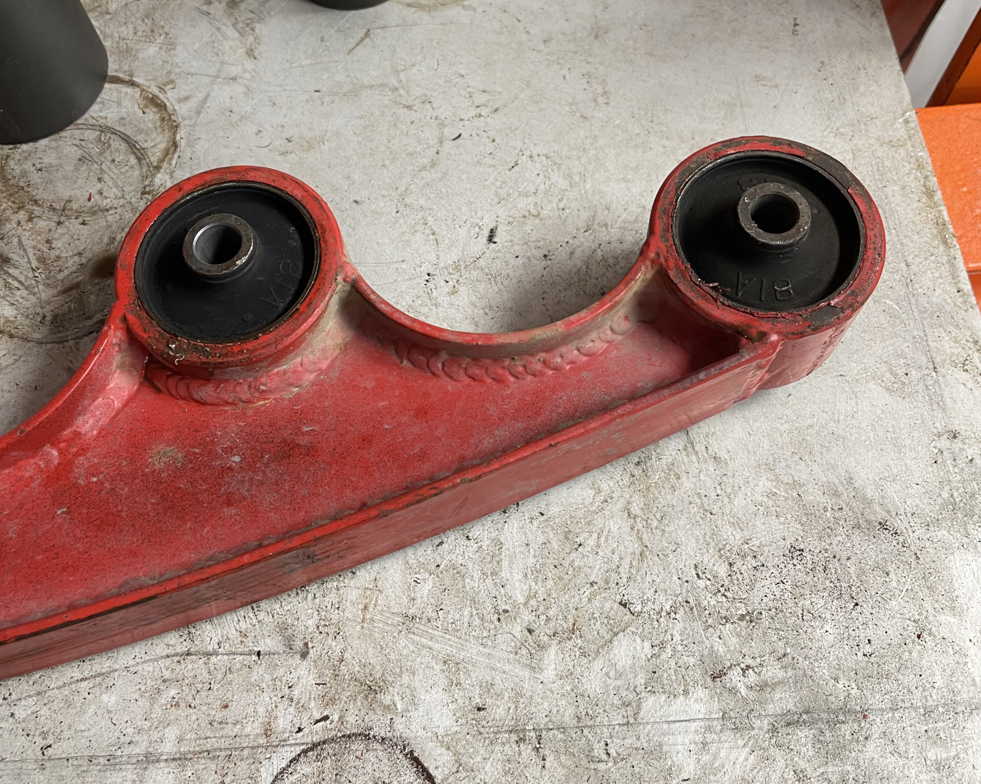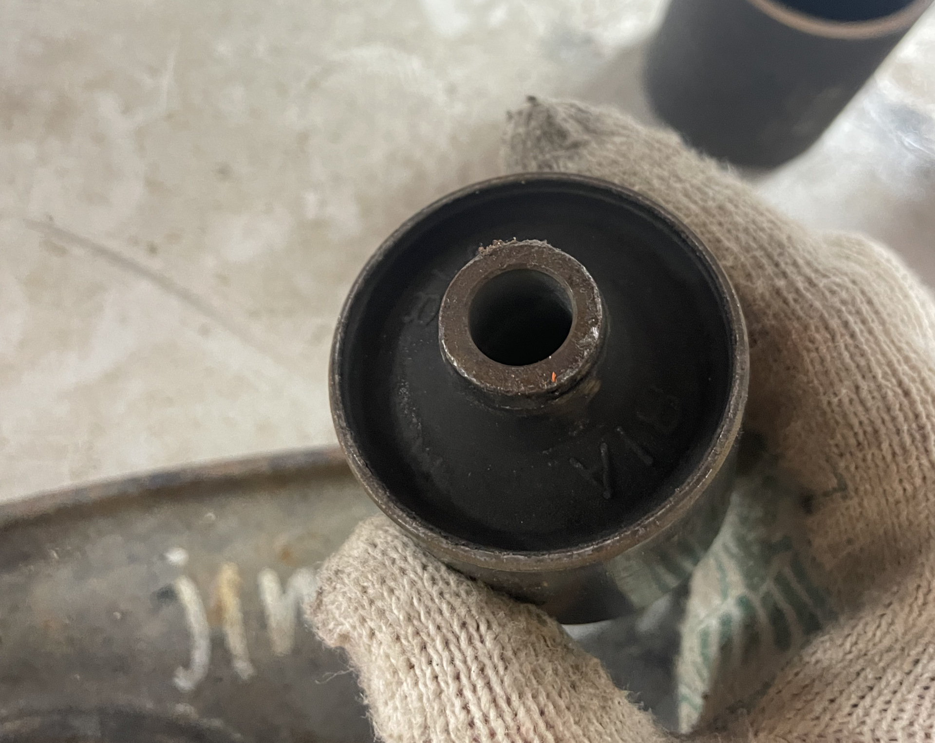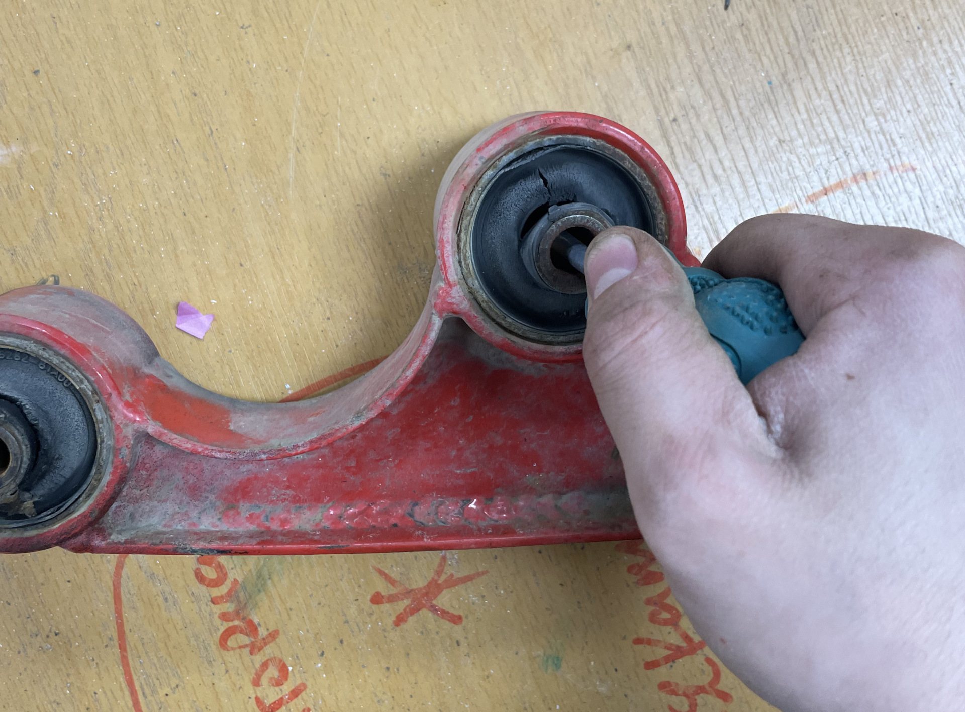 Вечером после работы выпрессовал из красных рычагов сайлентблоки. По процессу все просто, одну оправку под рычаг, другую сверху и давим.