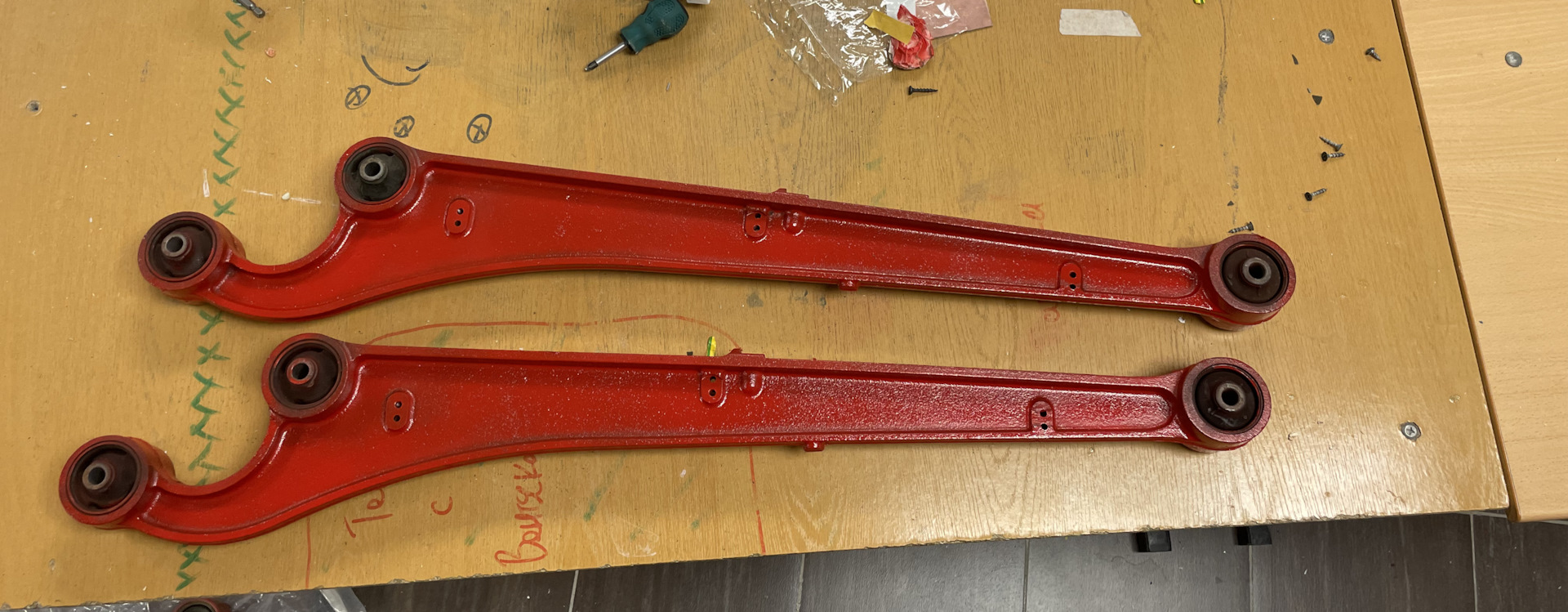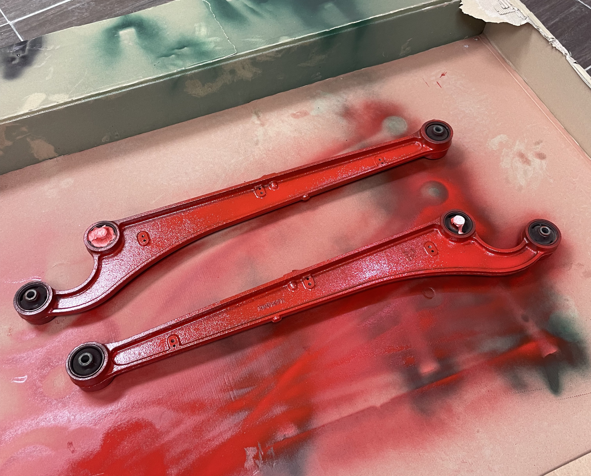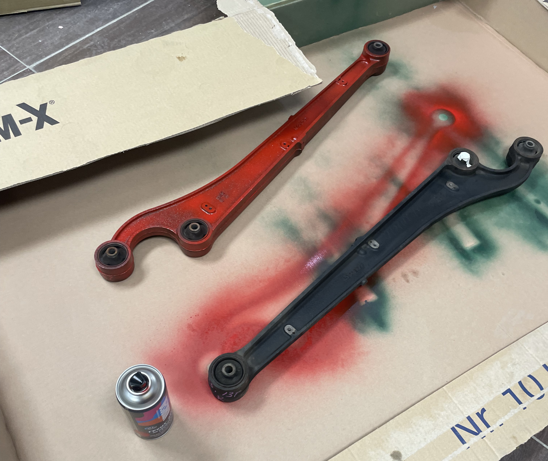 Чтобы было все красиво решил задние рычаги тоже покрасить в красный, для этого сначала хотел купить красный хаммерайт, но не смог его быстро найти, купил два красных баллона краски DECORIX грунт-эмаль по ржавчине 3 в 1 и покрасил, посмотрим на сколько хватит.