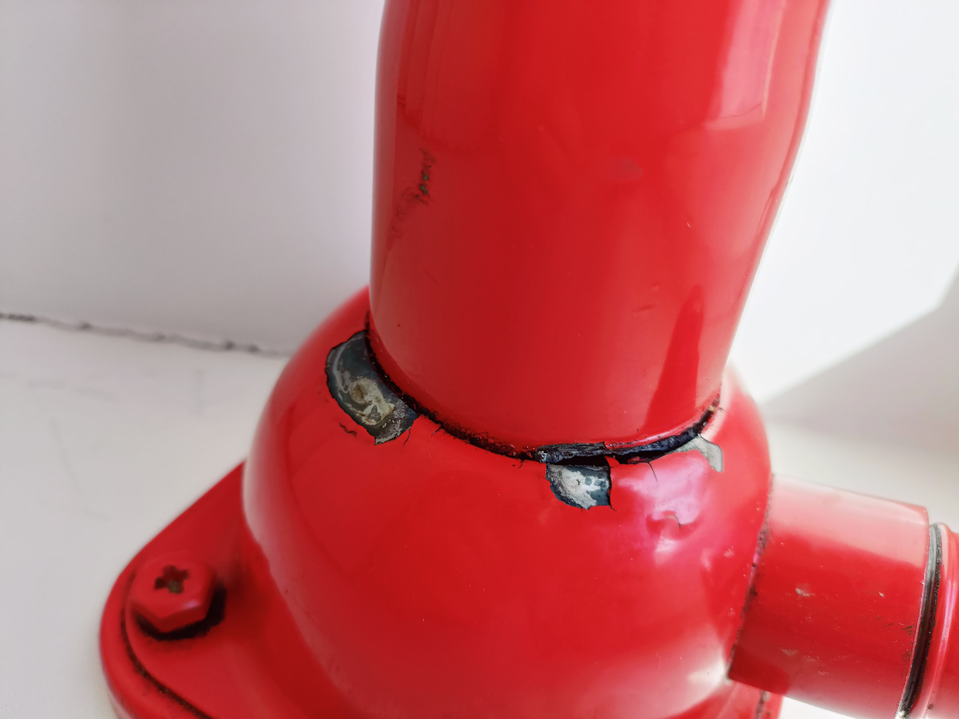 После нескольких раз использования появилась трещина на этом стыке, но особого беспокойства не вызывала. На днях перекидывал комплекты колес зима-лето и обнаружил, что сварной шов лопнул, шток подъема отклонился от опорной чашки и стало заклинивать механизм вращения, что крайне затруднило использование домкрата.