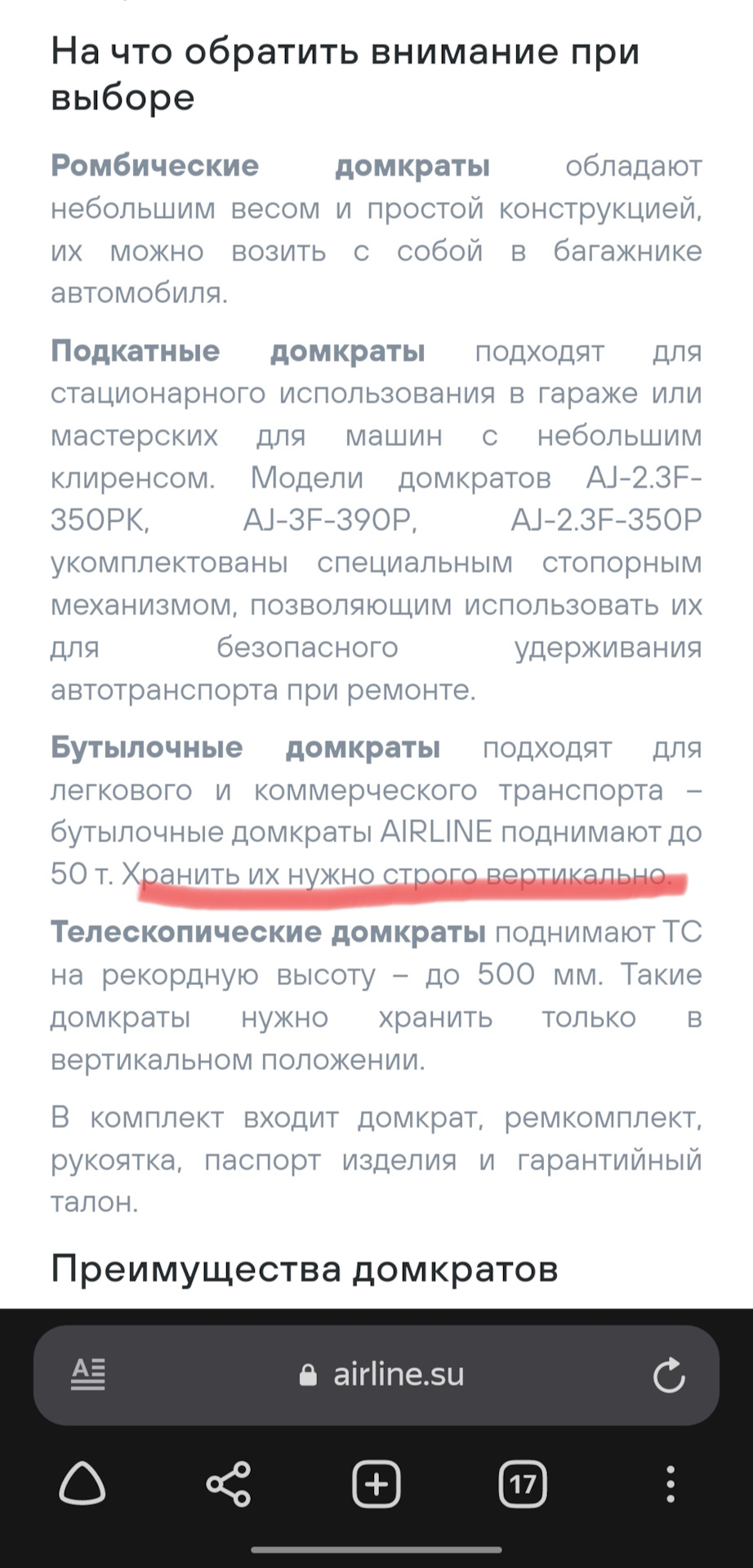 Бутылочный гидравлический домкрат по инструкции необходимо хранить и перевозить строго в вертикальном положении. Условие выполнено.