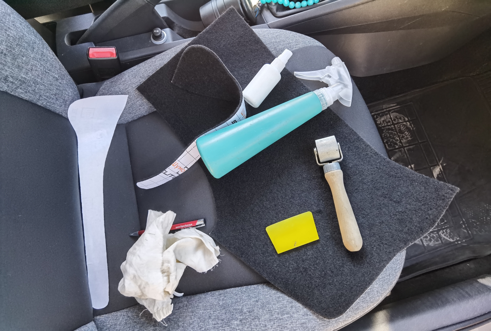 сделаны пока карманы дверей и накладка в багажнике. Сделал еще на заднюю полку, но пока не клеил.