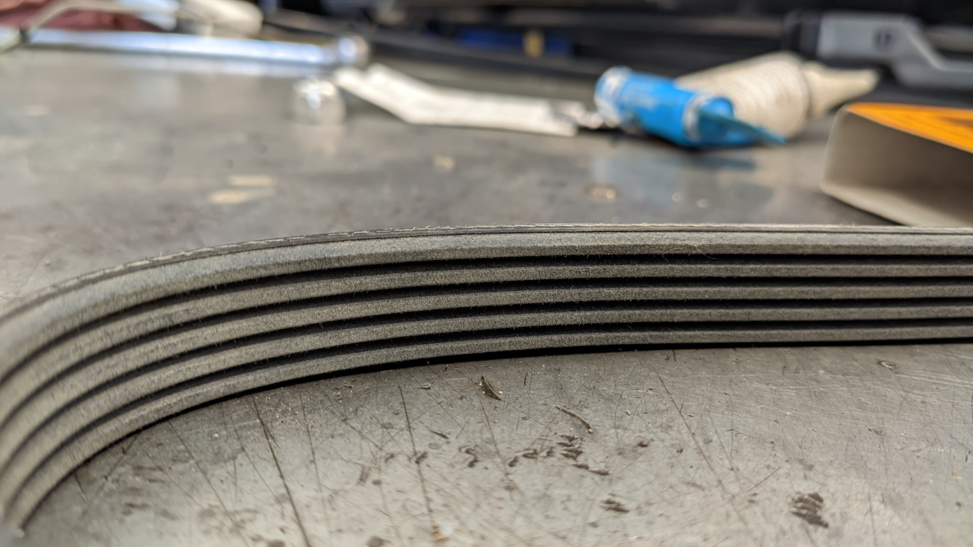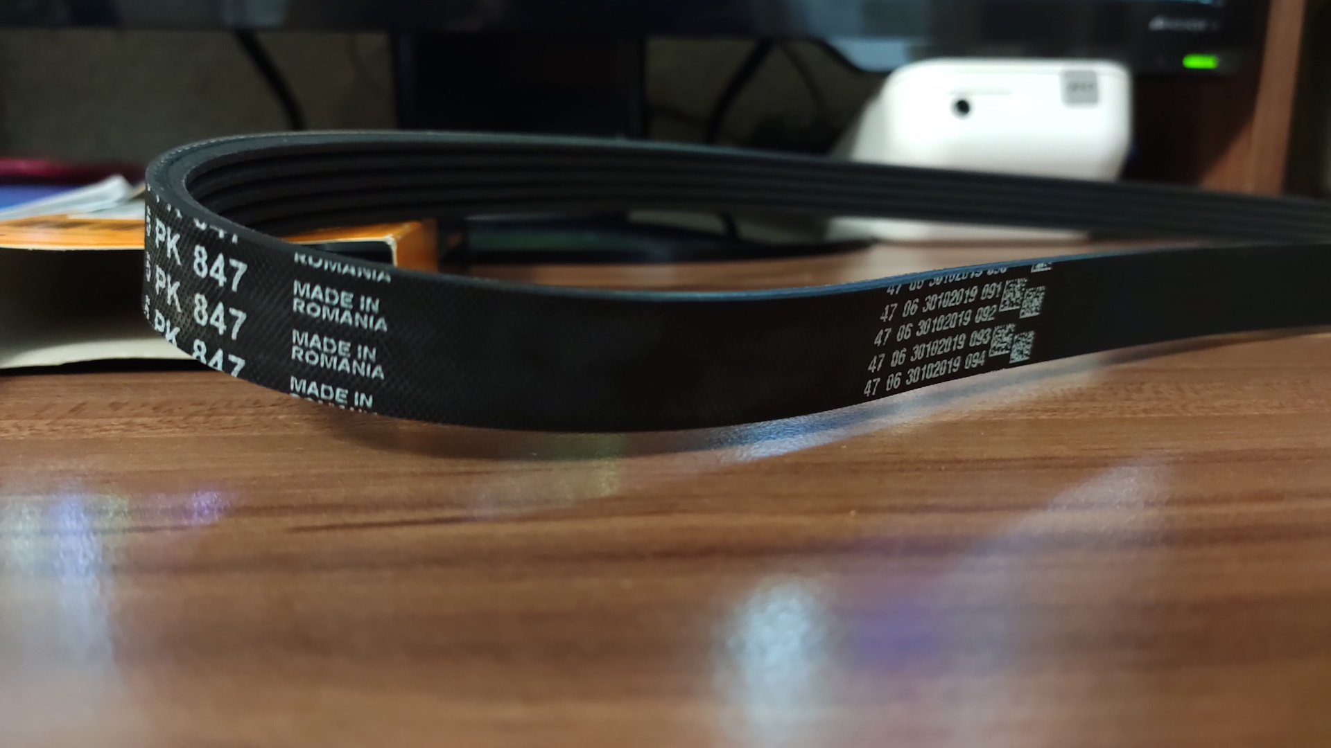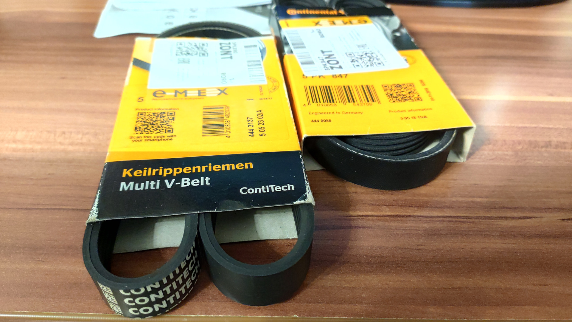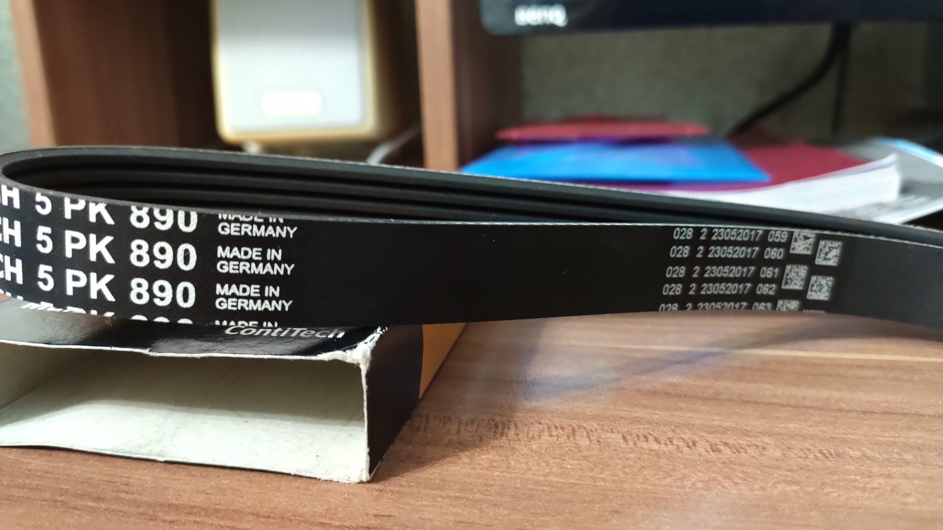 Всех категорически приветствую! В прошлой записи ставили защиту ремня ГРМ, ну и при установке как раз снимали один из приводных ремней. Оба стояли Contitech — один Румыния, другой Германия. Один был более менее, но с трещинами, а вот второй (Германия) 5PK890 на генератор, более печальный. Хоть и была поставлена защита, я решил не испытывать судьбу и заменить их.