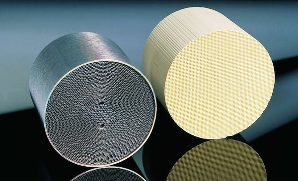Слева металл справа керамика. Металлический выглядит как спираль закрученная, керамический имеет ровные соты
