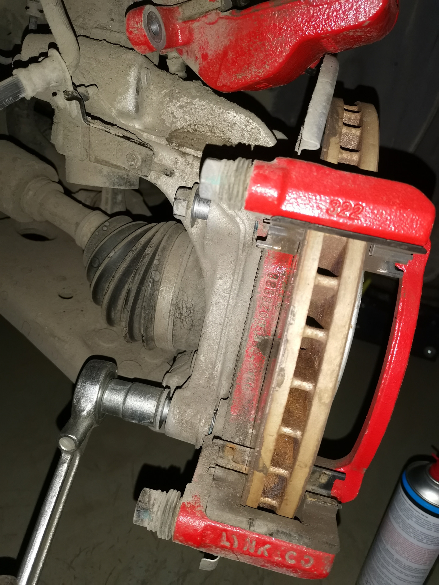 Замена проблем не вызвала, кроме откручивания двух болтов, крепящих тормозную скобу. Идут тяжеловато на откручивание, особенно в начале процедуры. Если замена не на подъемнике, то можно повернуть колесо на полоборота заранее, чтобы облегчить доступ к болтам.