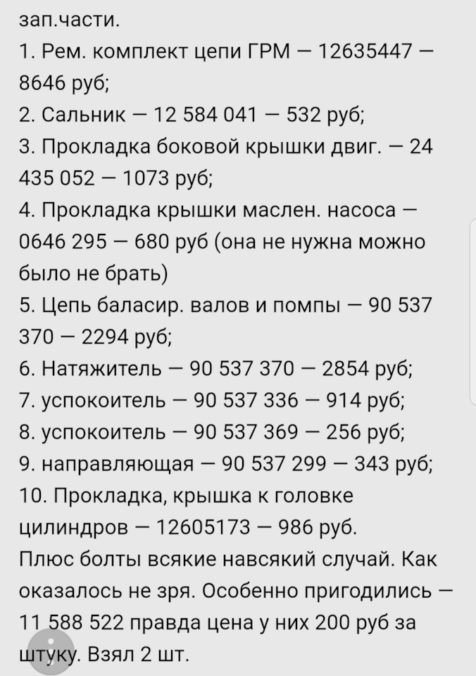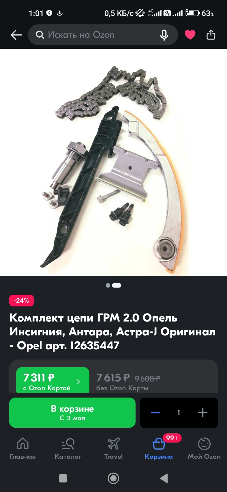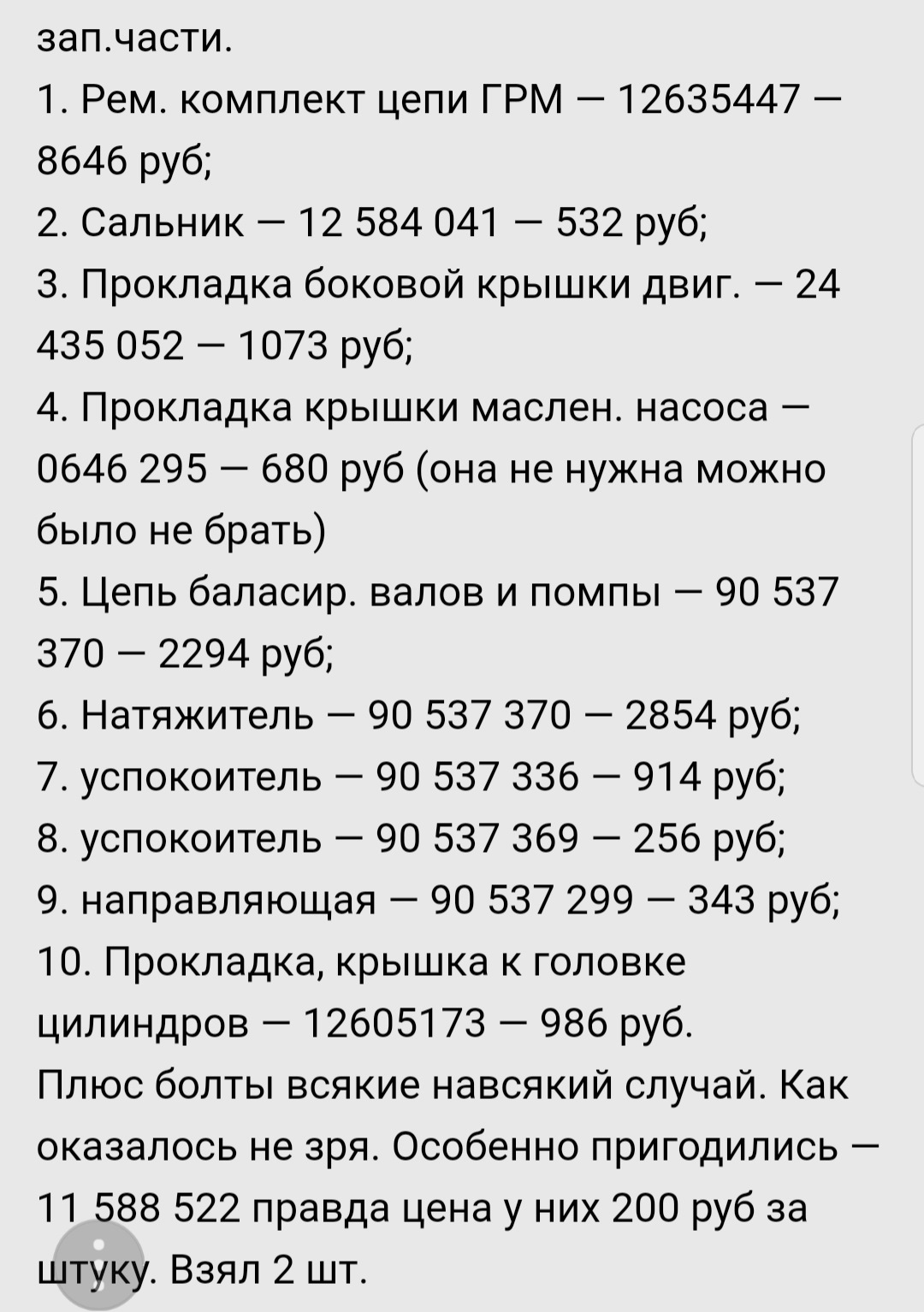 Привет Опелеводам! Примерно раз в неделю, бывает и реже при холодном запуске отчётливо слышан треск цепи, длится сек 3 не больше, кстати появляется он как раз перед заменой масла ХЗ КАК ЭТО СВЯЗАНО? Плюс появилась течь масла как раз в районе крышки цепи, конкретно так накапывает на пол гаража за ночь! Подскажите к чему мне готовится морально и финансово? К замене комплекта цепи или может каких успокоителей, натяжителей ? И если все-таки я попал на комплект цепи то сколько Рублей готовить на запчасти и работу в нынешних реалиях? И ЕЩЁ ВОПРОС… как в сервисе можно сделать диагностику цепи просто хочу быть чутка подкованым чтоб не НАЕБ… Для примера цен скину фото которое нашёл на озон, ЗА РАНЕЕ БЛАГОДАРЮ ЗА СОВЕТЫ! ПРОБЕГ РОДНОЙ 157000 НА ДАННЫЙ МОМЕНТ, ЦЕПЬ РОДНАЯ!