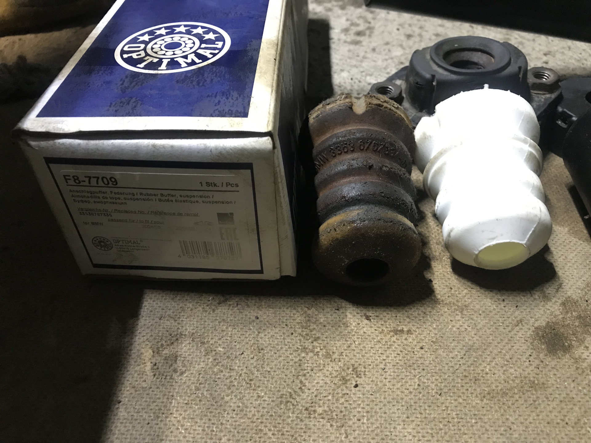 От прошлого авто (х1 е84) остался новый отбойник Optimal F8-7709. Решил сразу и его заменить (старый расслаивался). Он чуть короче троечного (прим на 1,5 см), в чашку встает без проблем, в пыльник тоже. Разницы особой думаю не будет, пробивать не должно