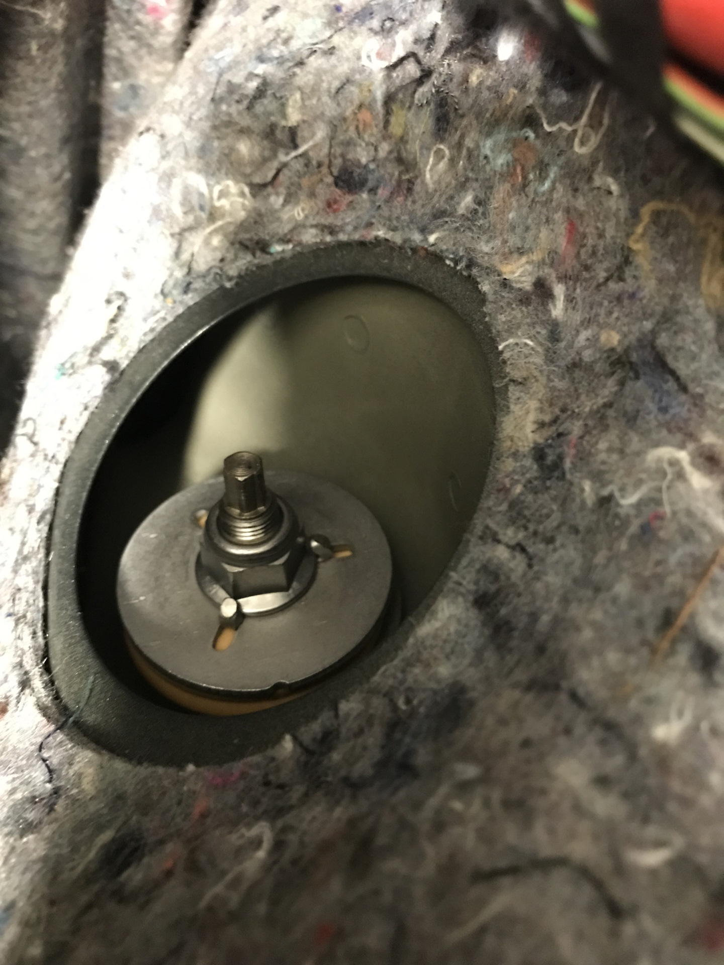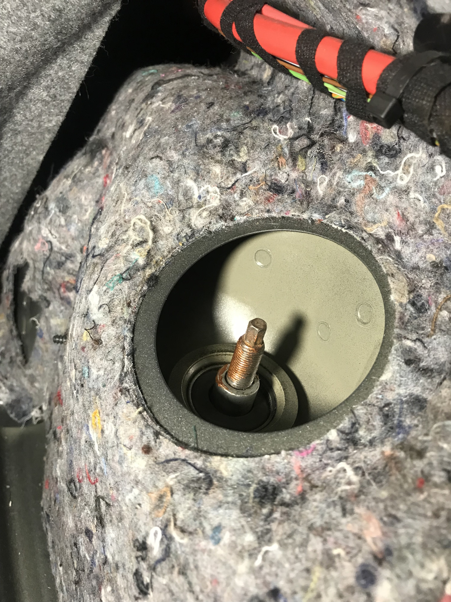 Далее видим резиновый защитный колпак-кругляш, убираем его и открывается доступ к верхней гайке. Начинаем с нее. Важный нюанс — если гайка с виду ржавая, то лучше отмочить ее WD-шкой. Верхний кончик при откручивании срывается на раз и тогда выход — только болгарка