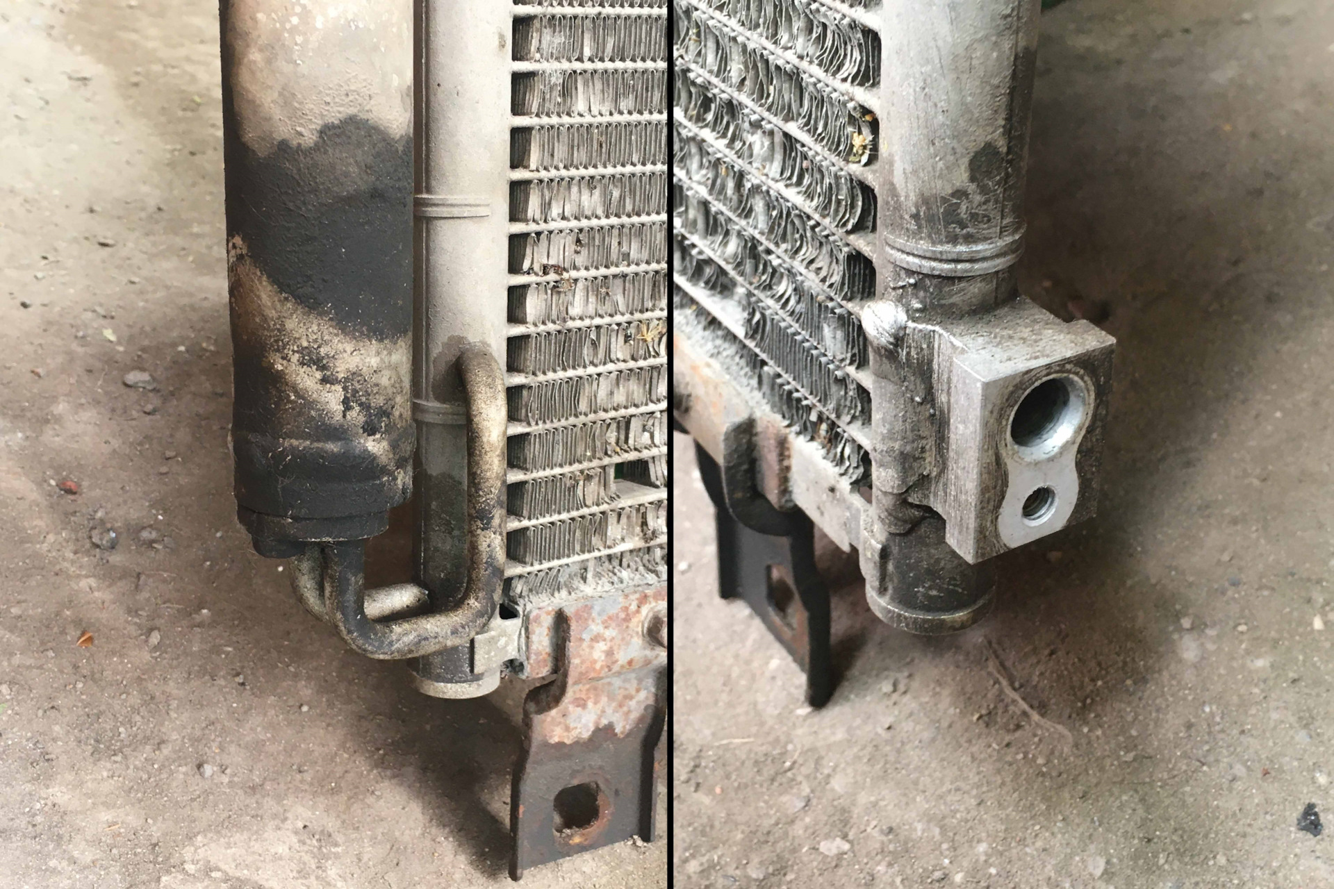 Немного запоздавший пост, но все же. Все нижеописанное я начал делать летом 2021 года. Вообщем в 2018 году сдох кондиционер, пытался его заправлять но через полтора месяца он закончился. На какое то время забил, но после замены основного радиатора решился все же что нужно ремонтировать и кондиционер. Ремонт кондиционера в домашних условиях дорогое дело само по себе. Что бы проверить кондиционер после каждого ремонта его нужно заправлять фреоном. То есть если например заменить радиатор и при этом прохлады в салоне не появится или она пропадает через пару месяцев то весь предыдущий ремонт был насмарку. Нужно опять искать утечку, разбирать, дефектовать, собирать и заново заправлять. Поэтому при заправки в фреон добавляют краску которая светится в ультрафиолете. Как раз такую краску мне заливали в последний раз. Что бы ее обнаружить купил УФ фонарик, такие фонарики бывают двух видов. У них разные длины волн, 365 и 395 нанометров. Мне подошел фонарик с длиной волны 395 нм. На 365 нм практически не чего не видно. Светим ночью по всей магистрали и смотрим где есть краска (в моем случае она тускло светилась зелено-желтоватым оттенком). Еще один вариант дефектовки это смотреть на масляные подтеки, особенно на соединениях системы кондиционирования. Конкретно у меня были сильные масляные подтеки в нижнем левом углу радиатора там где осушитель, там же сильнее всего светилась краска в УФ свете. Так же били небольшие подтеки на соединении нижней трубки с радиатором.