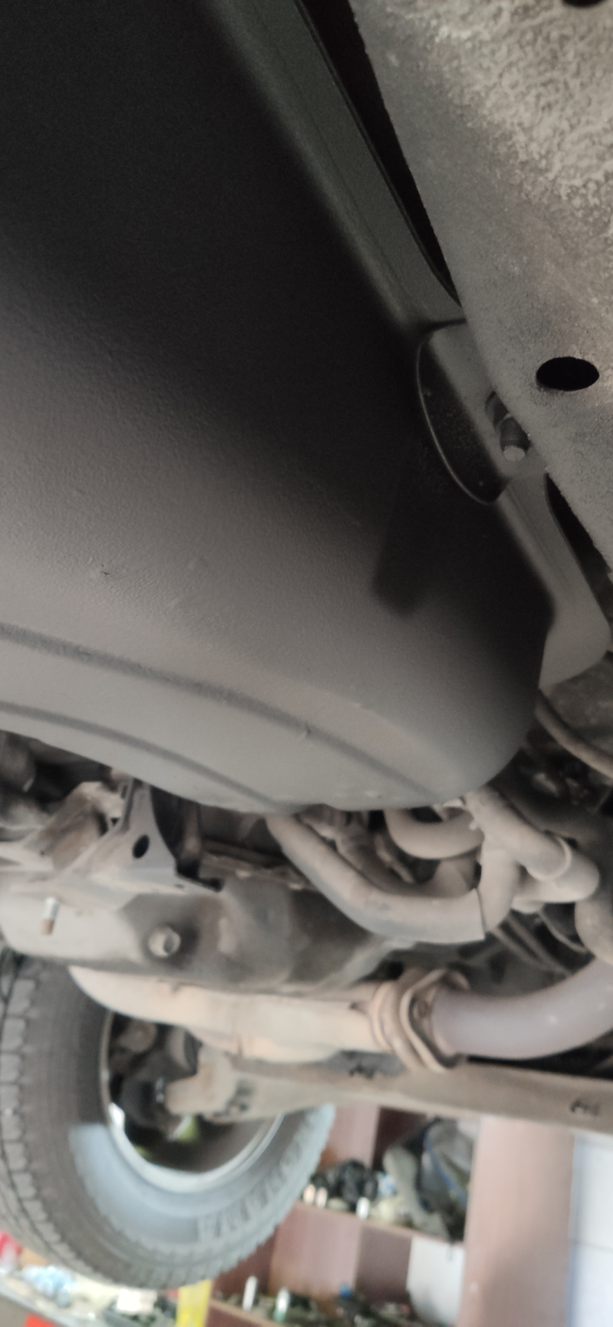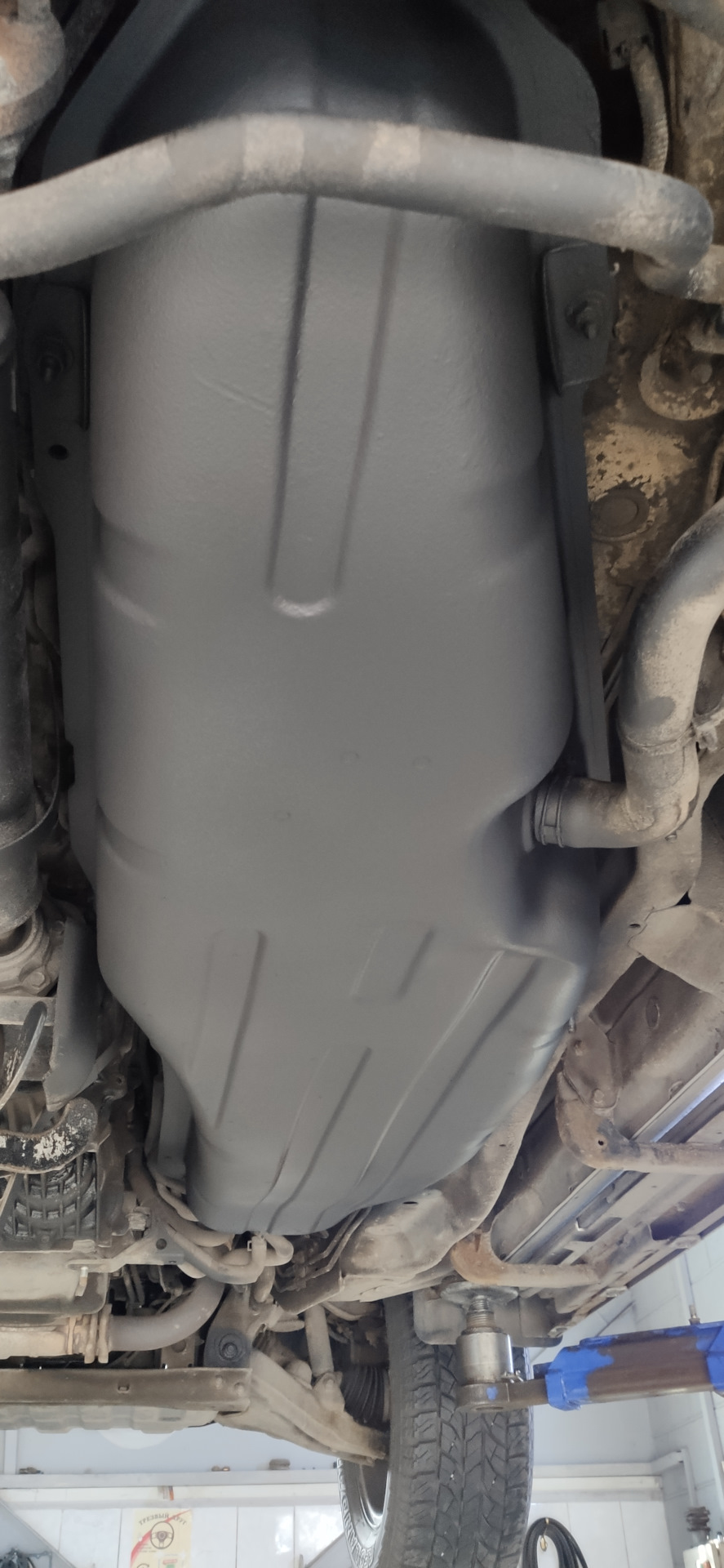 Надо было обновить антикоррозийное покрытие на баке. С собой привез два баллона антигравия KERRY KR-971.2, закатил автомобиль в бокс, подняли его на подъемник и сказали ждать в кофе-руме около 2,5 часов.