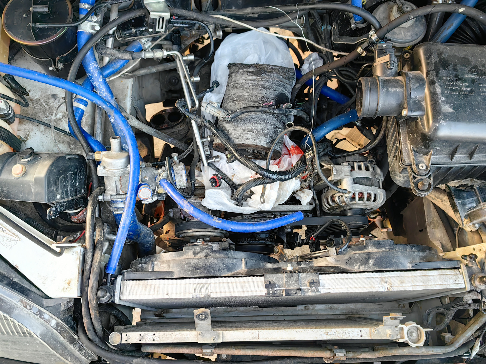 Установил ролики на блок цилиндров, поставил ремни навесного и кондиционера, натянув их. Вернул на место радиатор охлаждения с вентиляторами и термостатом.