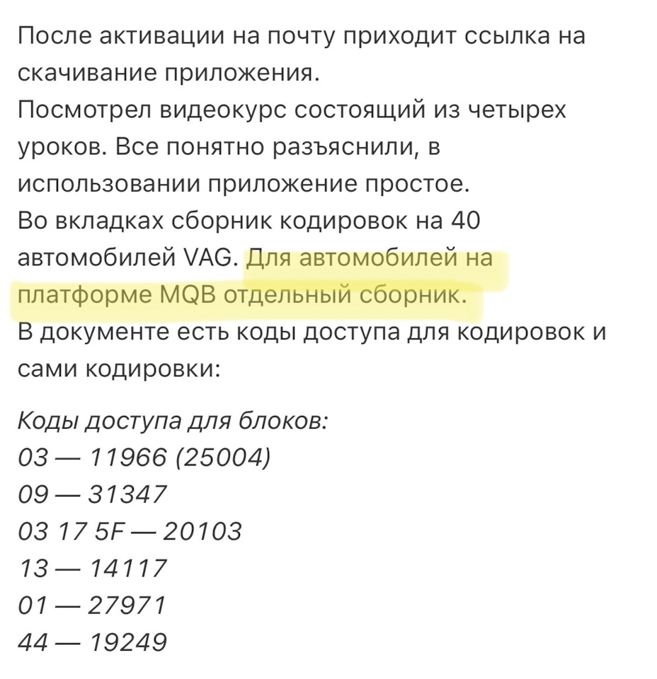 Пришла дальнейшая инструкция по активации, видеокурс и сборник кодировок VAG.