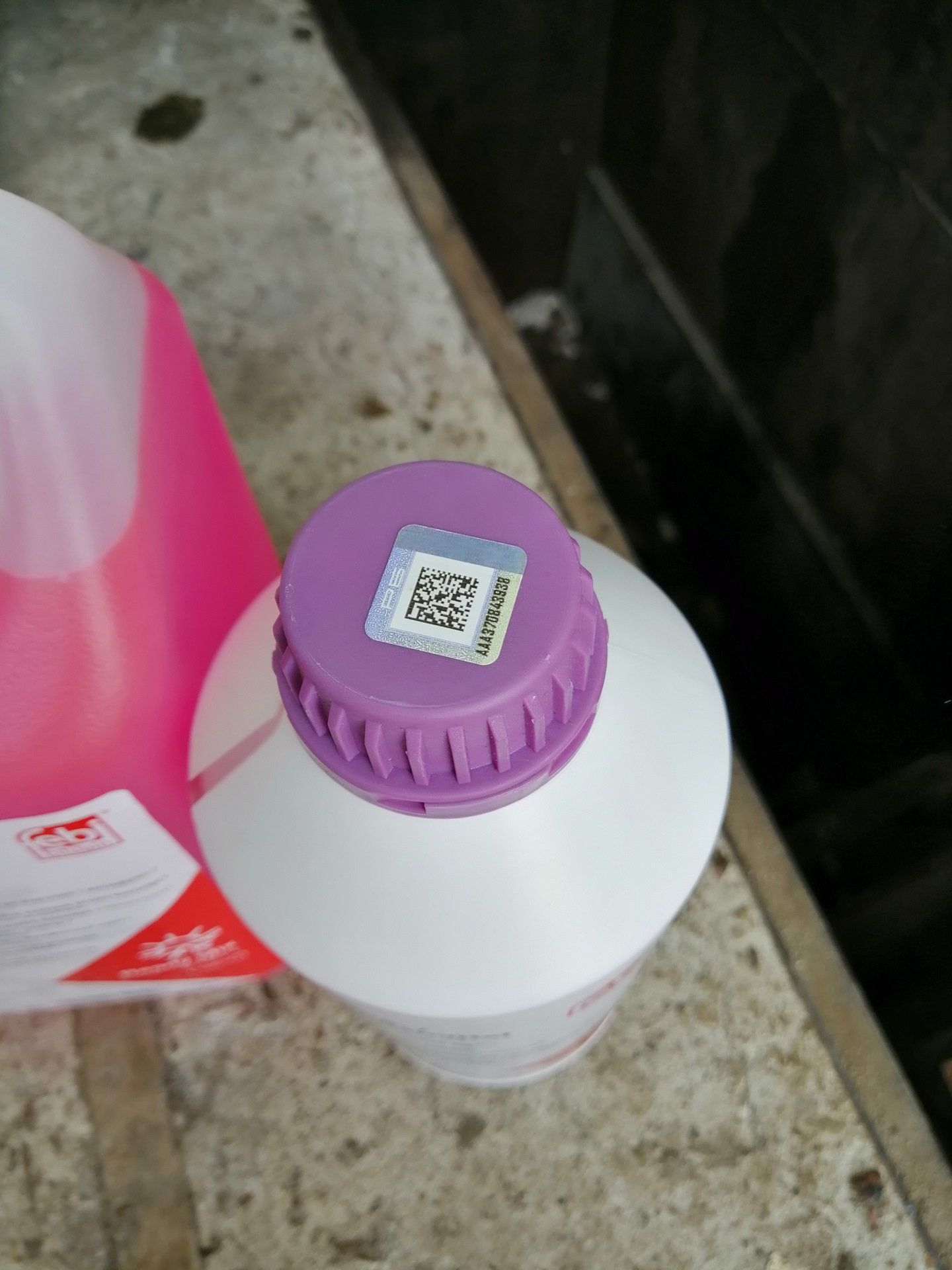 6. Заливаем свежий антифриз. Для заливки использовал концентрат и готовый антифриз Febi G 12++ . Замечу, что важно залить сразу разведённый концентрат (либо лить разведённый до нужно температуры антифриз, попутно контролируя температуру замерзания). Так как сам концентрат очень густой и вероятность поймать воздушную пробку очень высока. Если создастся такая ситуация, следует вернуть датчик температуры на место и начать интенсивно жмякать патрубки ОЖ, тогда воздух будет выходить.