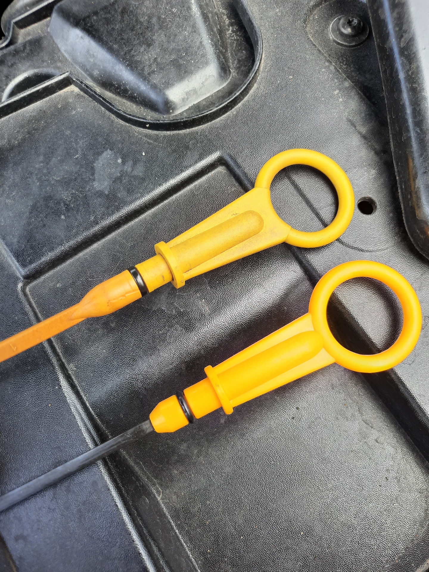 По следам записей с D2 решил заменить щуп уровня масла. Оказывается, родной пластиковый имеет свойство ломаться по прошествии некоторого времени. Да и вид старого не вызывает восторга, весь потемневший и с трудом можно различить уровень по меткам. Решено — сделано.