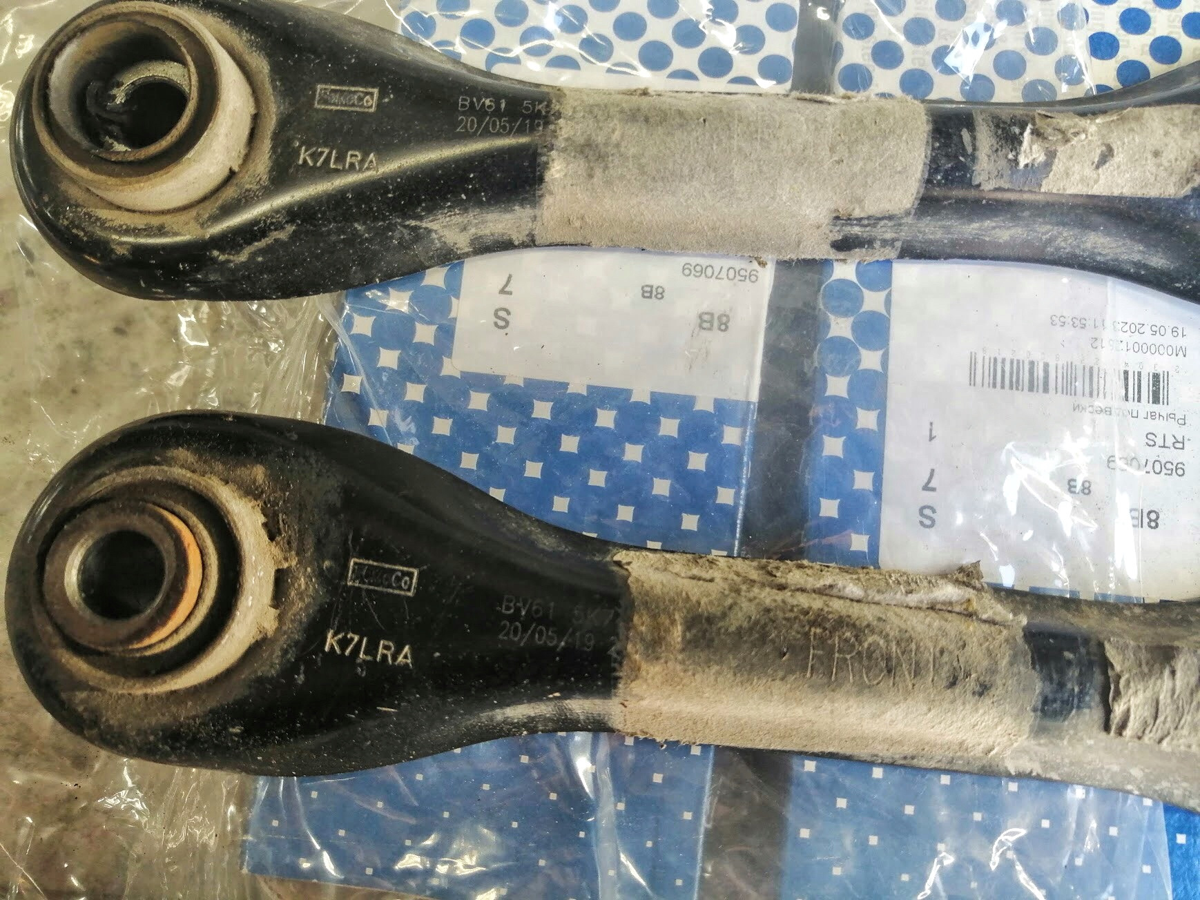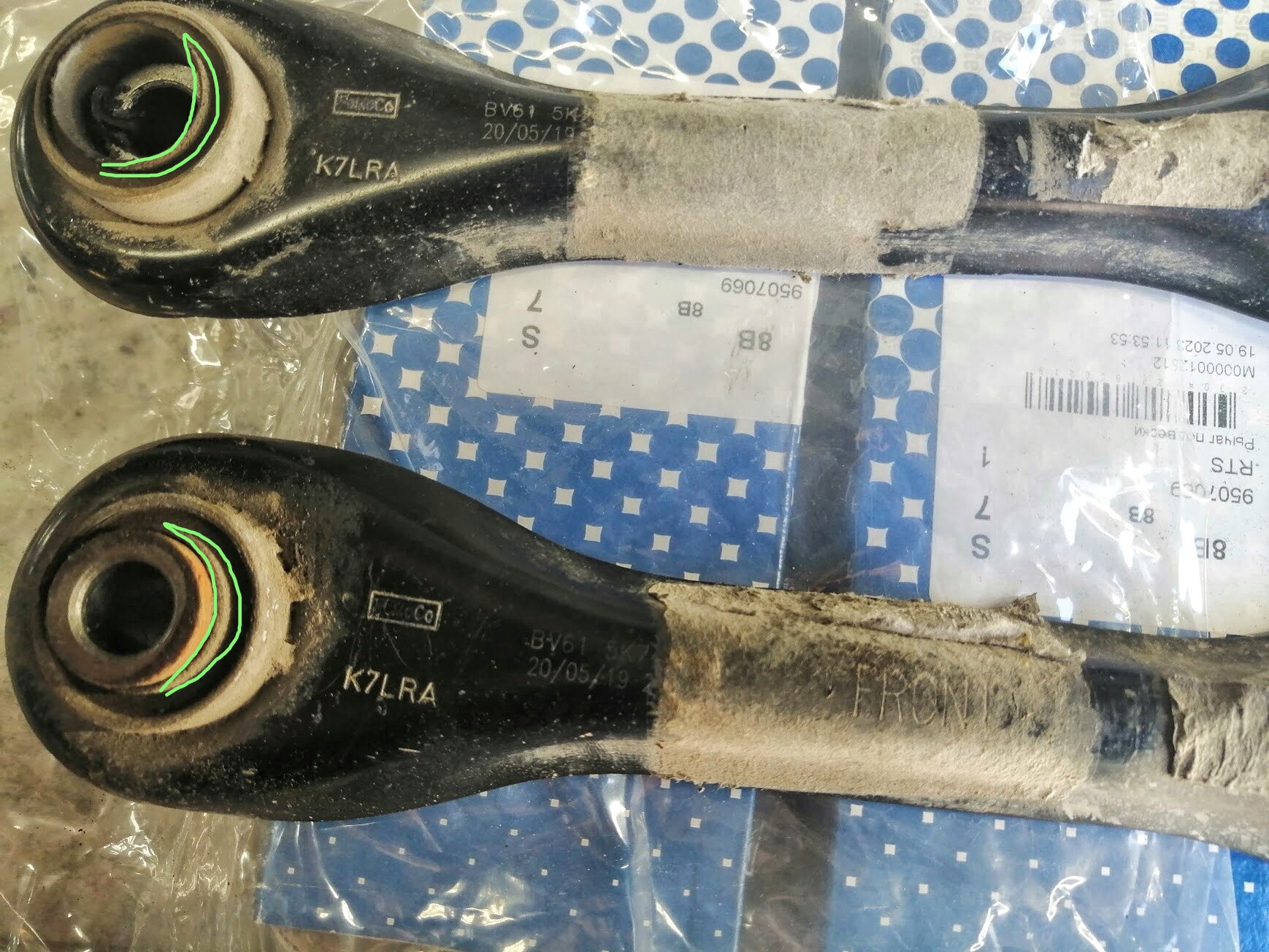 Не знаю как у 2019г, но у 2012 и 2013, те что с завода — (инфа проверена на двух комплектах) на самой резине сайлентблоков выштампованы артикулы, какие-то еще заводские значения и штамп fomoco. Если память не изменяет тоже история у сайлентблоков в подпружинных рычагах, а вот у серпов надписей нет