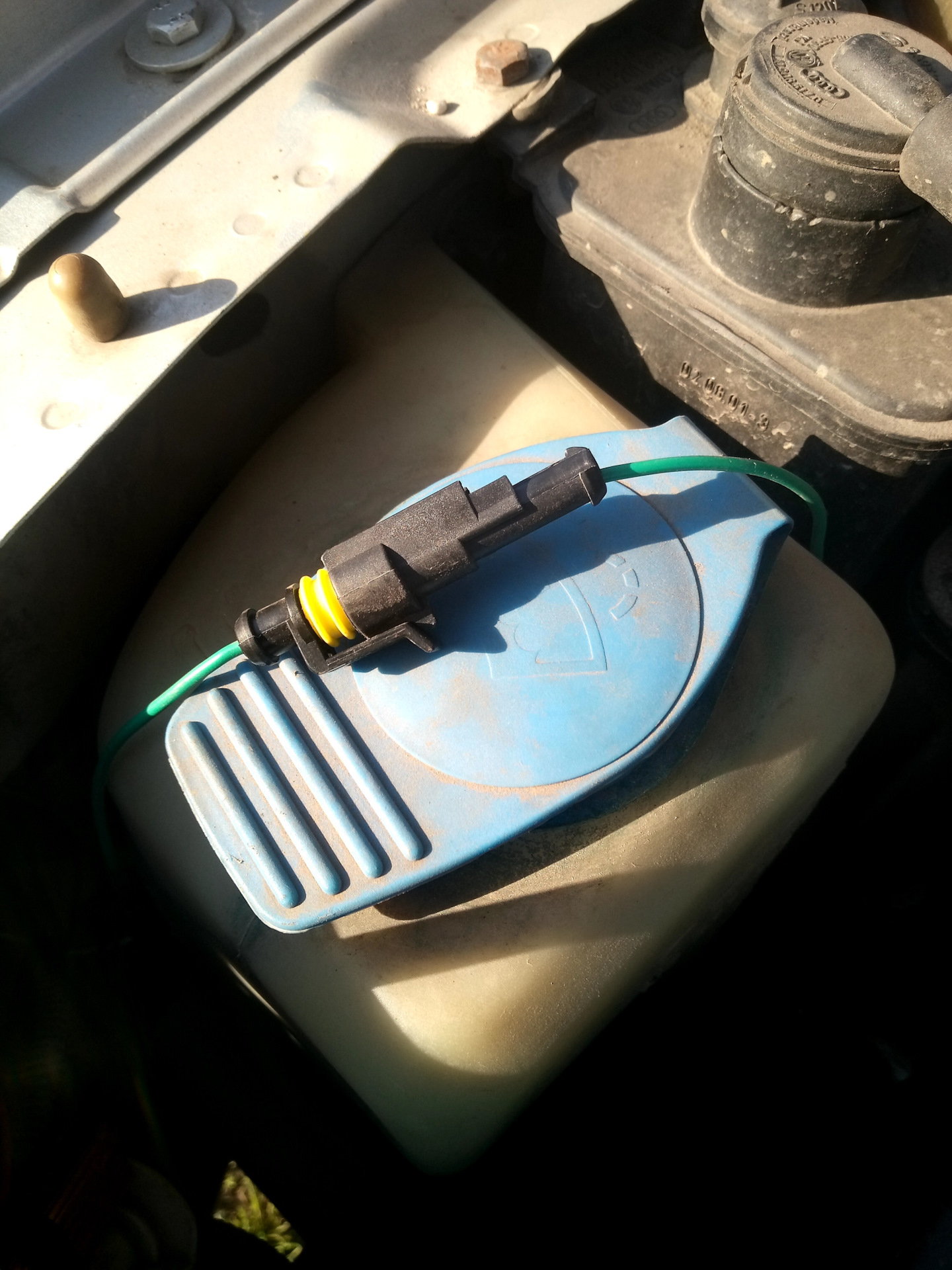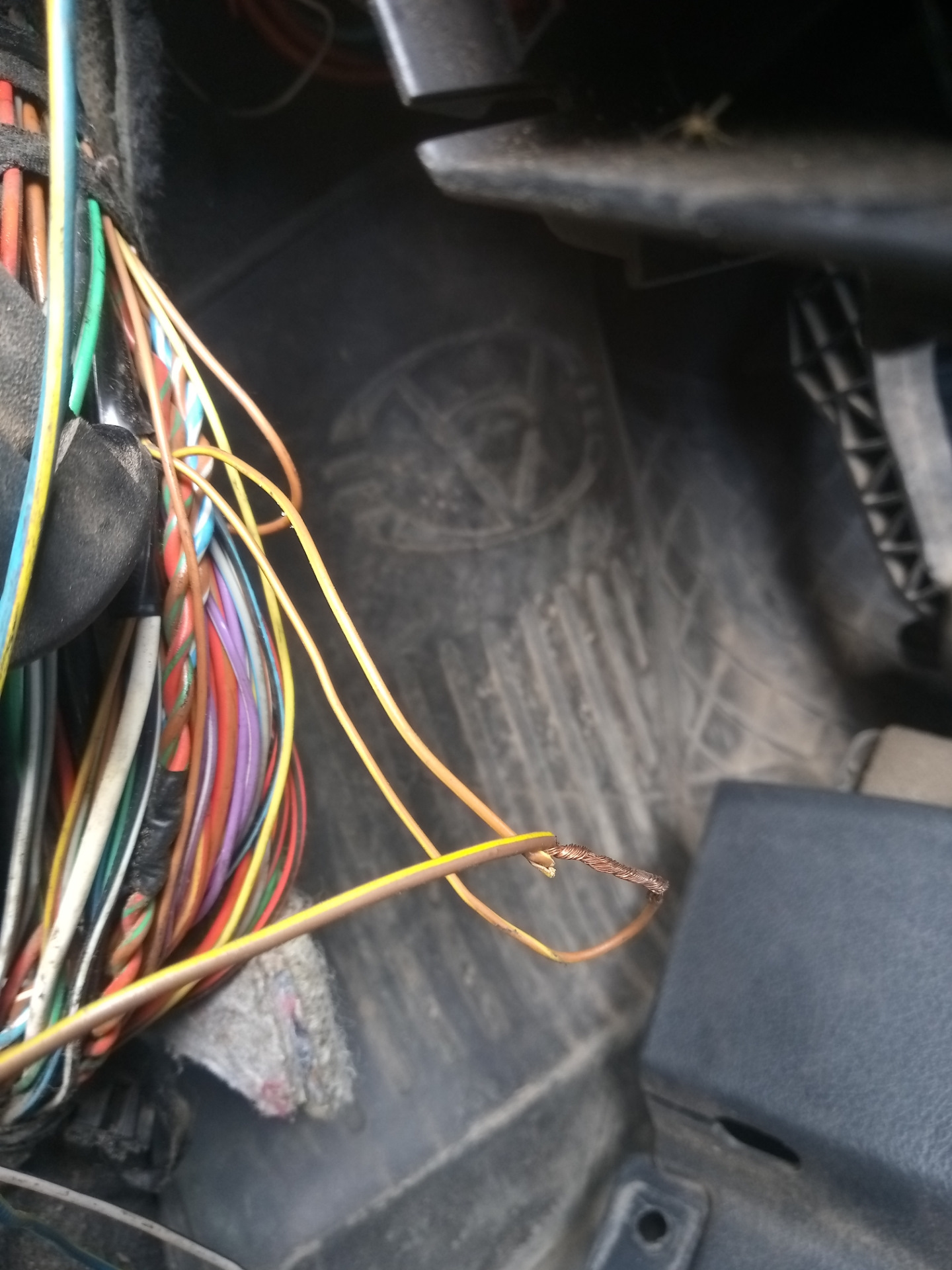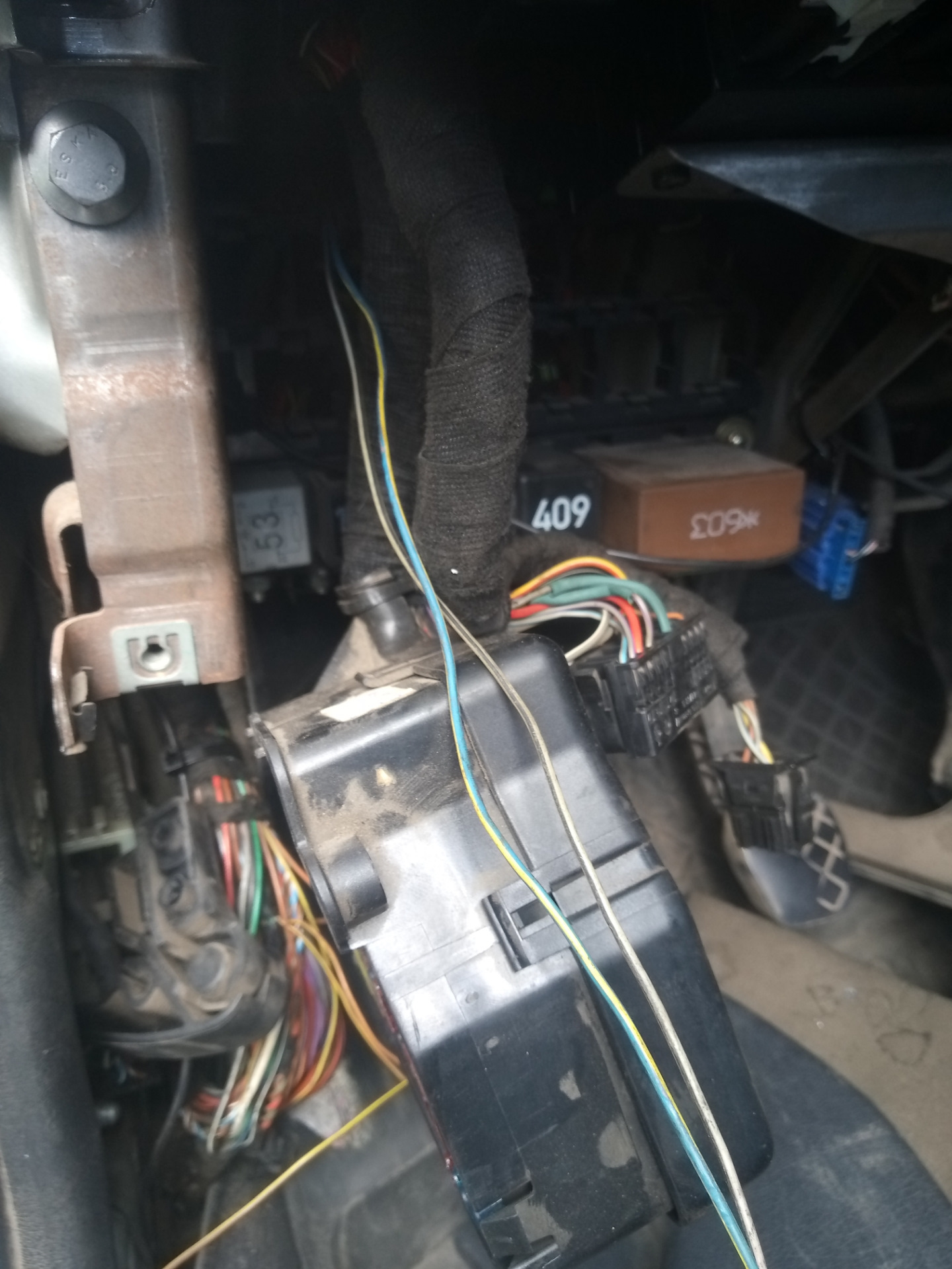 Но тогда он будет светиться всегда, пока включено зажигание и выключен свет. Отключается в любом другом положении переключателя. Не очень удобно, если, например, где то стоишь с запущенным двигателем. Решил сделать отключение ДХО при поднятом ручнике. Нашел ближайший провод ручника. На левой стойке снизу, под блоком предохранителей.