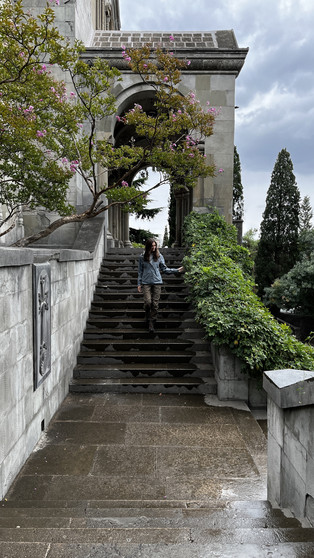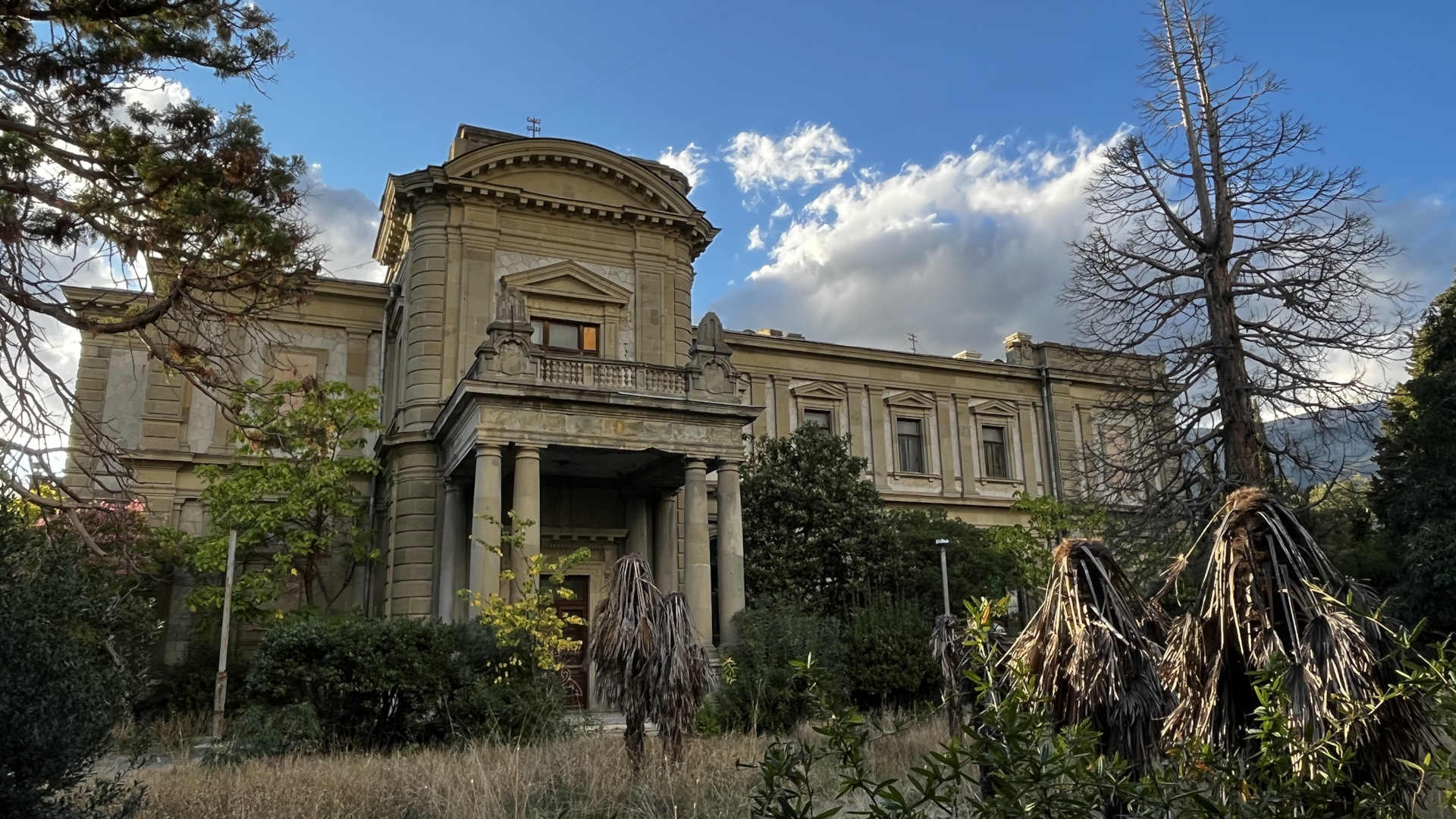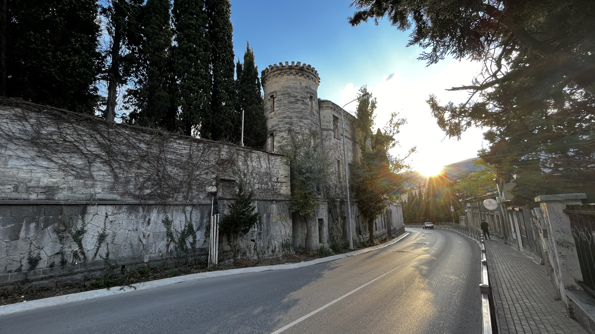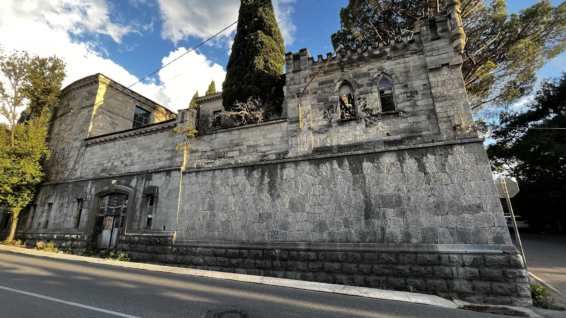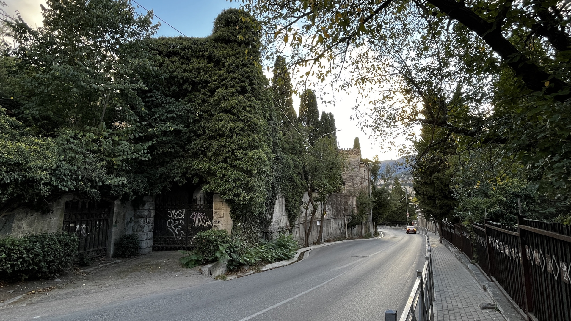 Основными целями Ялты были заброшки, даже на пляж не сходили. Возле усадьбы Мордвинова подошла бабуля и подсказала ещё один интересный объект — особняк Овчинникова, который в годы ВОВ использовался «СС». На нем даже сохранилась символика дивизии. Оговорюсь сразу, внутрь попасть легально нельзя и есть высокие риски быть пойманными. Взяли языка из местных бабулек и нашли проход. Но полазить полноценно не вышло. Объект под охраной.